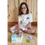 Súčasťou sú hracie bankovky a drevená kreditná karta – ideálne na nácvik základných počtov, cien a platobných situácií.
