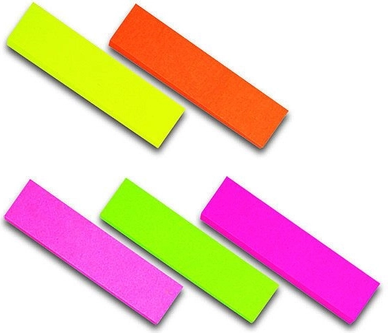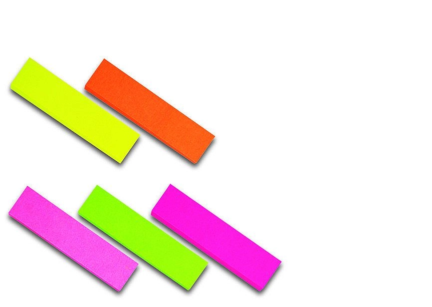 Praktické neónové samolepiace záložky na rýchle označovanie a orientáciu v dokumentoch. Balenie ponúka 5 výrazných farieb po 100 listoch (zelená, žltá, oranžová, ružová, tmavoružová). Záložky sú ľahko odnímateľné bez zanechania stôp a vďaka rozmeru 12 × 50 mm sa zmestia aj na okraj stránok, zošitov či kníh.