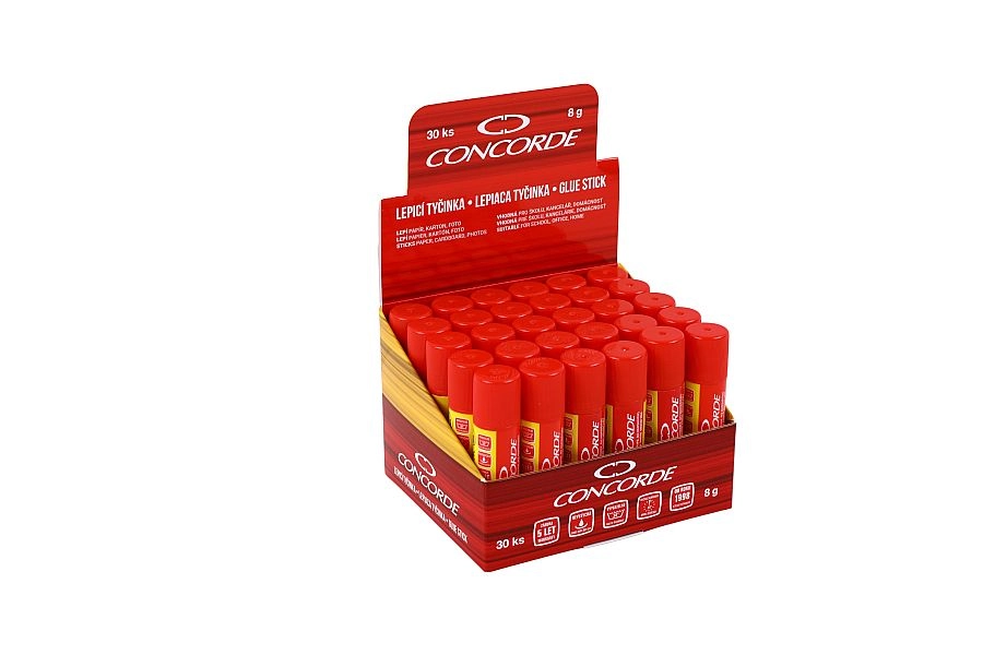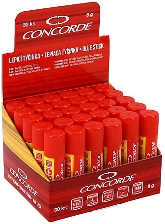 Praktická a spoľahlivá lepiaca tyčinka CONCORDE s hmotnosťou 8 g na každodenné použitie v kancelárii, v škole aj doma. Rýchle a čisté lepenie papiera, lepenky, látok aj fotografií, nevysychá, je bezpečná pre deti a ľahko vyprateľná. Overená kvalita – testované, lepí až 5 rokov.
