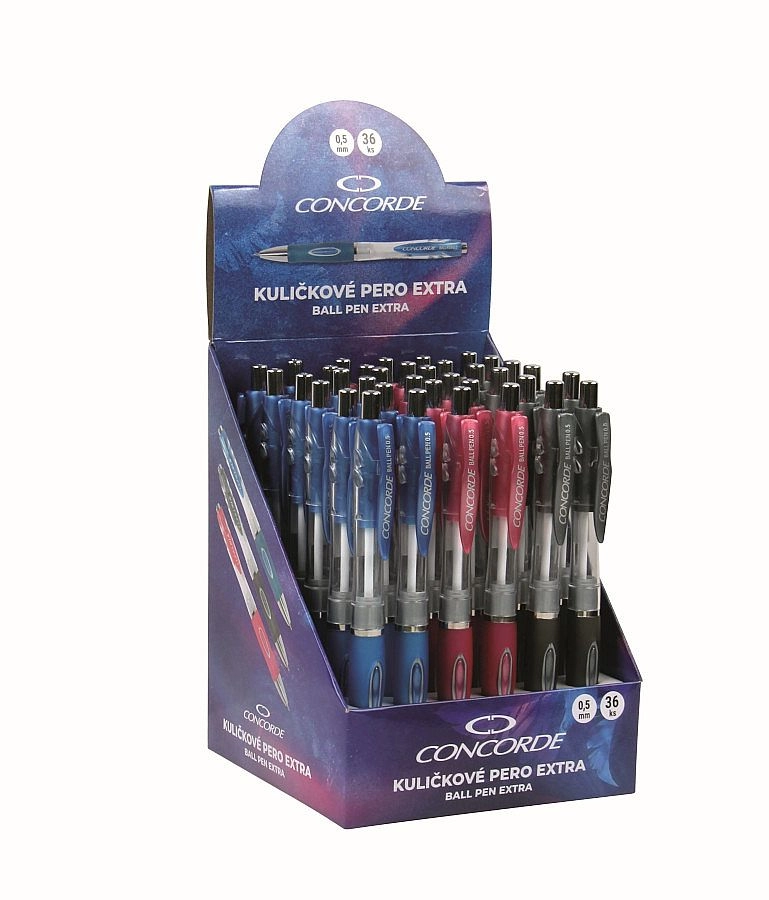 Ergonomický, pogumovaný úchop zvyšuje komfort pri dlhodobom písaní a stláčací mechanizmus umožňuje rýchle a spoľahlivé vysunutie hrotu bez straty vrchnáka. Pero sa dodáva v atraktívnom mixe metalických farieb (modrá, sivá, ružová) a súčasťou je modrá náhradná náplň Extra pre dlhšiu životnosť.