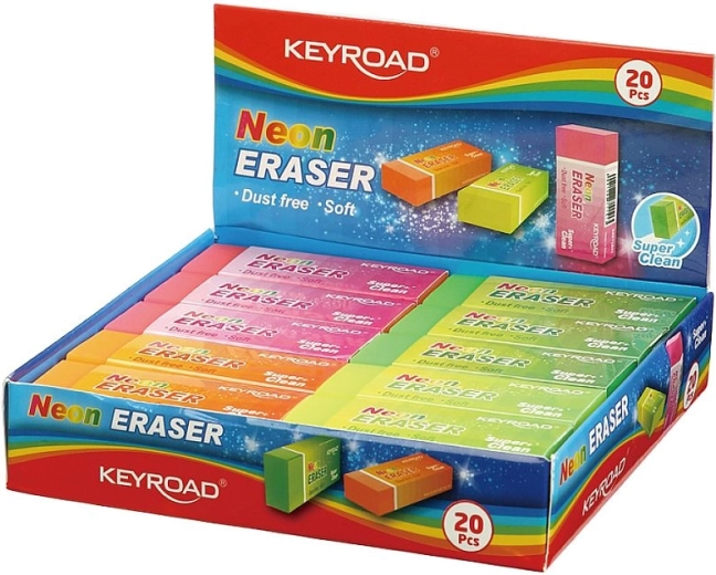 Neónová guma KEYROAD je ideálnou voľbou do školy, kancelárie aj na domáce použitie. Vďaka mäkkému zloženiu ponúka jemné a účinné gumovanie grafitu bez poškodenia papiera. Fluorescenčné farby z nej robia nielen praktický, ale aj atraktívny doplnok peračníka.