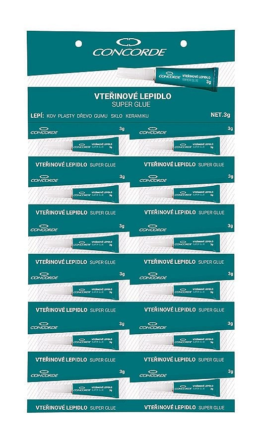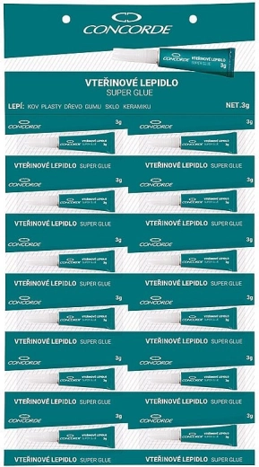 Univerzálne sekundové lepidlo CONCORDE s hmotnosťou 3 g na rýchle a pevné opravy v domácnosti aj dielni. Vhodné na kov, plasty, drevo, gumu, sklo a keramiku. Poskytuje okamžitý účinok a po vytvrdnutí zanecháva priehľadný spoj s pevnosťou až 140 kg/cm².