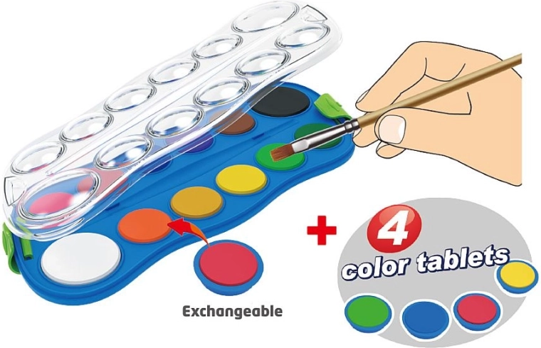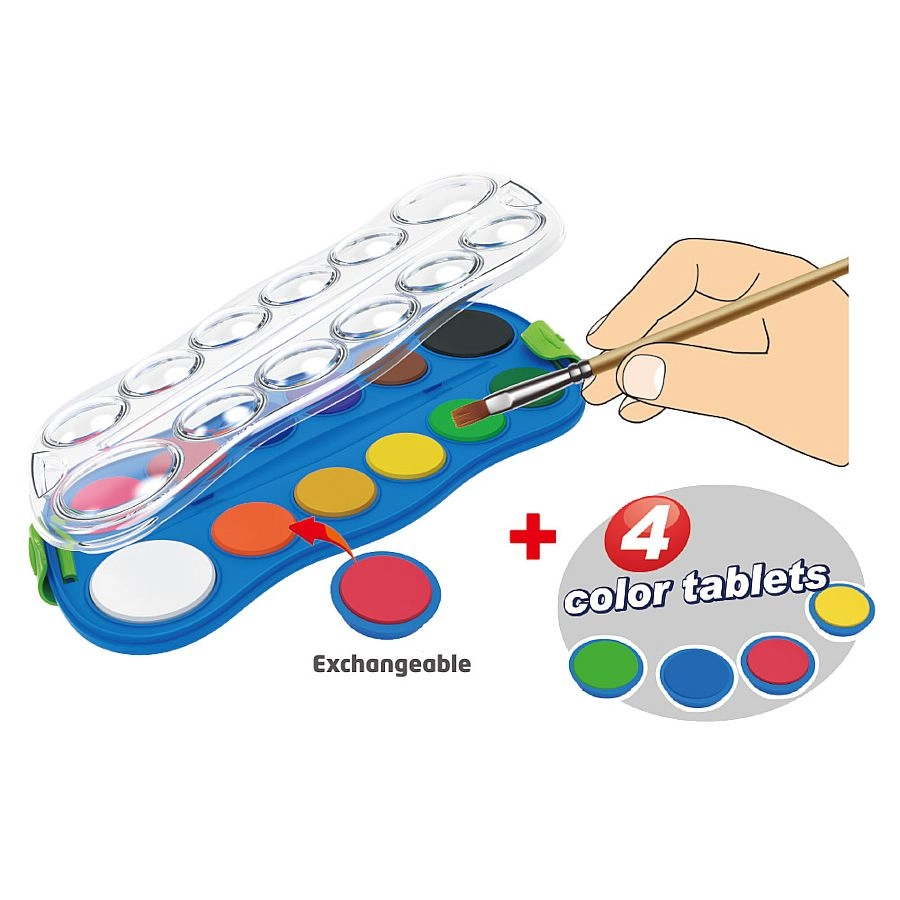 Súčasťou balenia je 12 základných farieb doplnených o 4 vymeniteľné farby, ktoré rozšíria vašu paletu možností. Farby sa ľahko nanášajú, dobre sa miešajú a sú vhodné na papier a výtvarné techniky s vodou.