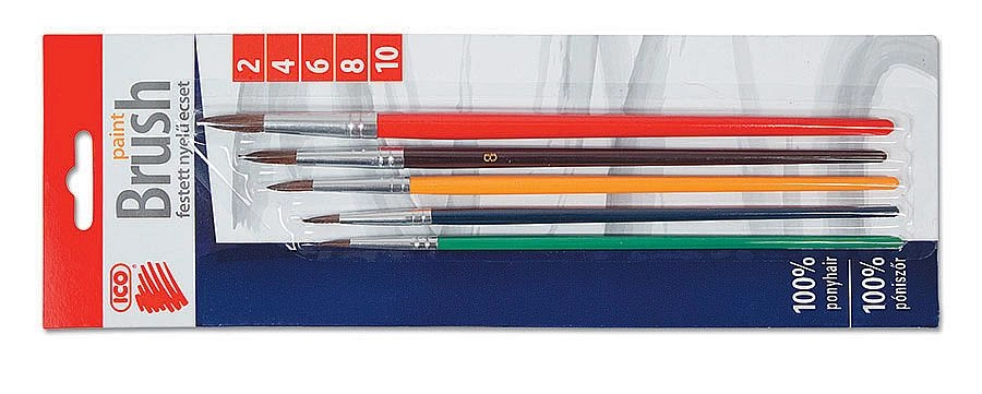 Praktická sada 5 okrúhlych štetcov ICO vo veľkostiach 2–10 je ideálna na školskú výtvarnú výchovu aj domáce tvorenie. Ponúka jemný vlas pre plynulé ťahy, okrúhle hroty na detailnú prácu aj plošné nanášanie farby a farebne lakované drevené rukoväte pre pohodlné držanie. Dodávané na blistri pre prehľadné uloženie.