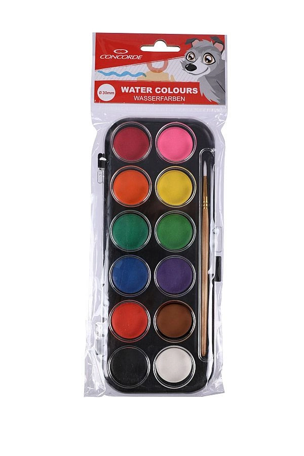 Praktická sada školských vodových farieb CONCORDE ponúka 12 sýtych odtieňov v kompaktnom plastovom puzdre s transparentným viečkom. Každý pigment má priemer 30 mm pre jednoduché naberanie farby, súčasťou je štetec a balenie je vhodné na zavesenie.