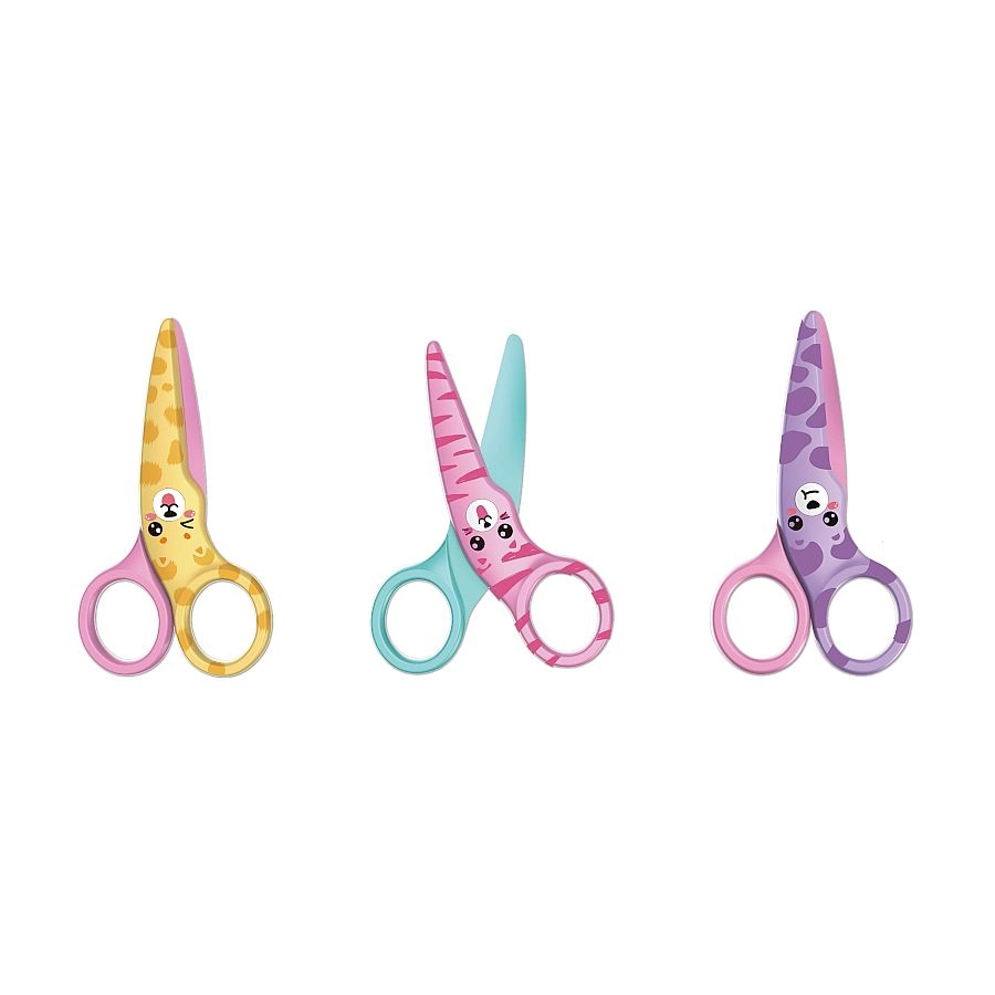Veselé detské bezpečnostné nožnice s motívmi zvieratiek s dĺžkou 10,5 cm sú ideálne na prvé kreatívne tvorenie. Majú nekovové ostrie, okrúhlu špičku a ergonomické plastové držanie pre pohodlné a bezpečné strihanie aj pre najmenšie deti. Dostupné v asortovaných farbách.