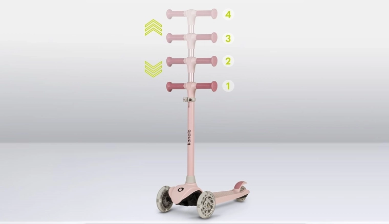 Jednoducho nastavíte výšku T-bar riadidiel v štyroch krokoch (cca 65–80 cm), takže kolobežka vydrží dlhšie a prispôsobí sa postave dieťaťa.