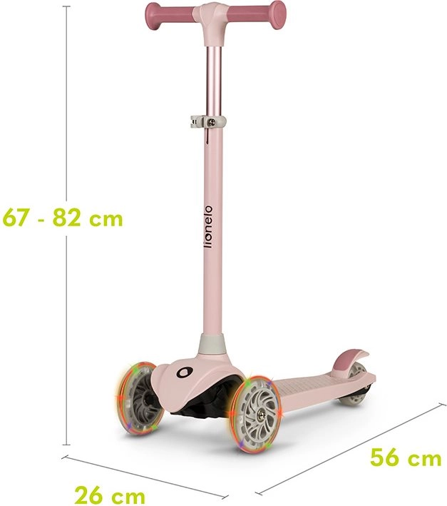 Ľahká a stabilná detská trojkolesová kolobežka LIONELO Jessy Pink Rose podporuje rovnováhu a motoriku detí. Ponúka 4-stupňové nastavenie výšky riadidiel, protisklzovú nášľapnú plochu, zadnú nášľapnú brzdu a svietiace LED kolieska s ložiskami ABEC-7 pre plynulú jazdu. Maximálna nosnosť 50 kg a obmedzenie uhla riadenia 65° pre bezpečnejšie ovládanie.
