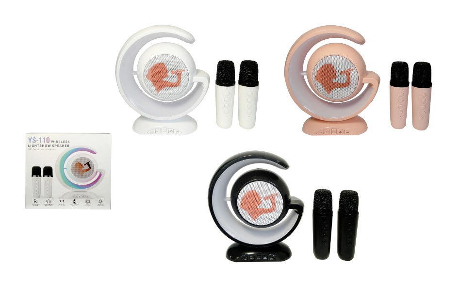Vytvorte si domácu karaoke scénu s bezdrôtovou sadou, ktorá kombinuje štýlový reproduktor v tvare polmesiaca a dvojicu mikrofónov na duetové spievanie. Vďaka Bluetooth pripojeniu jednoducho prehráte hudbu z telefónu či tabletu a užijete si farebné LED svetelné efekty, ktoré podčiarknu atmosféru.