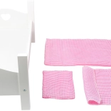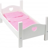 Súčasťou postieľky je mäkký vankúš, deka a prestieradlo s ružovým vzorom pre maximálne pohodlie bábik.