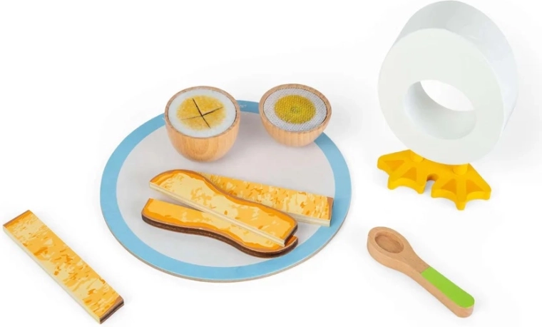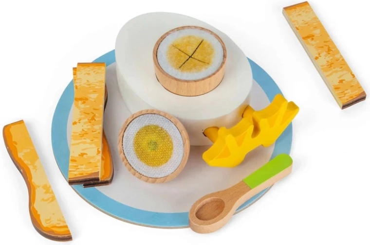 Táto kúzelná drevená raňajková sada prináša realistický zážitok z vajíčka na mäkko – s rozkošným kalíškom s kuriatkovými nožičkami, dvoma polovicami vajíčka s mäkkým plsteným žĺtkom a toustovými „vojakmi“ na namáčanie. Deti môžu servírovať na tanierik a jesť lyžičkou, čím rozvíjajú koordináciu ruka–oko aj fantáziu pri hre na domácnosť.