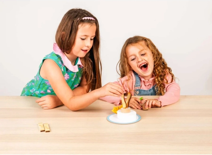 Set je vyrobený z odolného FSC certifikovaného dreva a navrhnutý pre malé detské rúčky. Hra podporuje rané zručnosti – od jemnej motoriky cez komunikáciu až po zdieľanie pri spoločnom stolovaní. Bezpečnosť podčiarkuje precízne spracovanie a balenie bez plastov v recyklovateľných materiáloch.