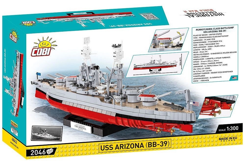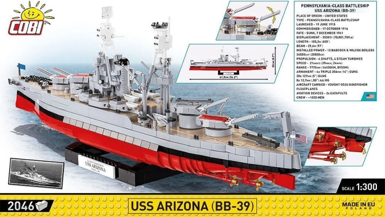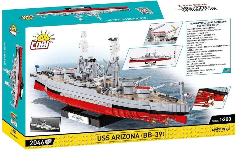 Legendárna bojová loď USS Arizona, symbol udalostí v Pearl Harbore, prichádza ako verne spracovaná stavebnica v mierke 1:300 s dĺžkou približne 61,5 cm. Vďaka pokročilým konštrukčným technikám model presne vystihuje proporcie, charakteristický tvar trupu aj nadstavby a poteší zberateľov i fanúšikov námornej histórie.