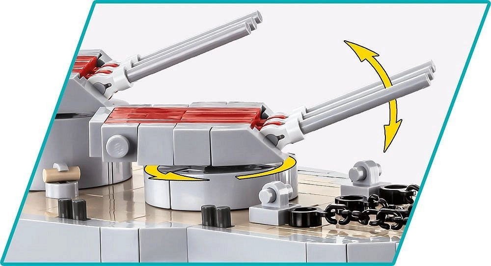 Model ponúka množstvo funkčných detailov pre atraktívne vystavenie aj hranie: otáčavé delové veže, nastaviteľné elevácie hlavn í, skrúty a kormidlá ako pohyblivé prvky a elegantný expozičný stojan s menovkou. Vysokokvalitné potlačené dieliky zaručujú stálosť farieb aj tvarov.