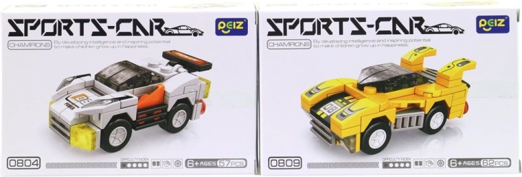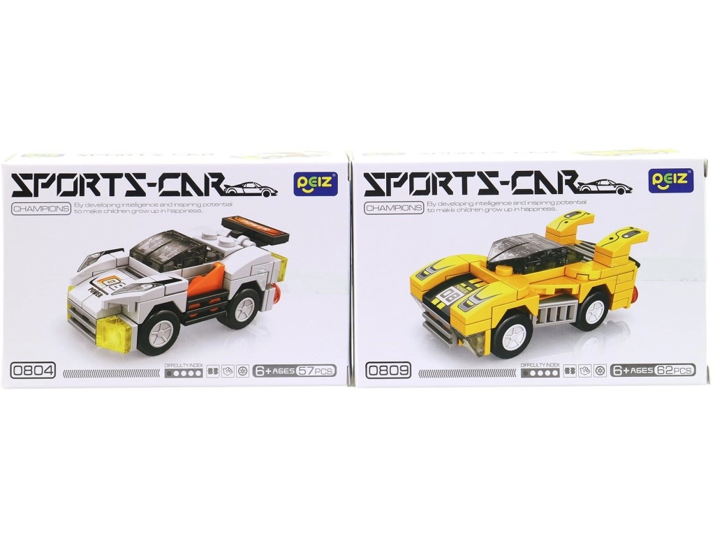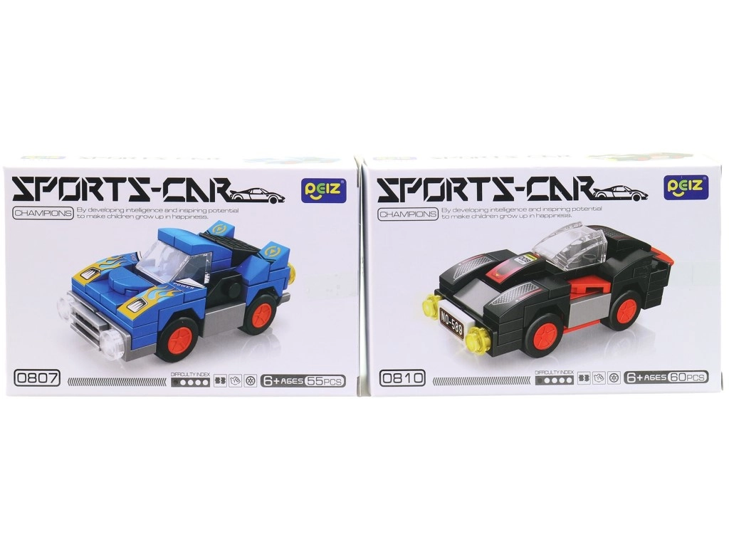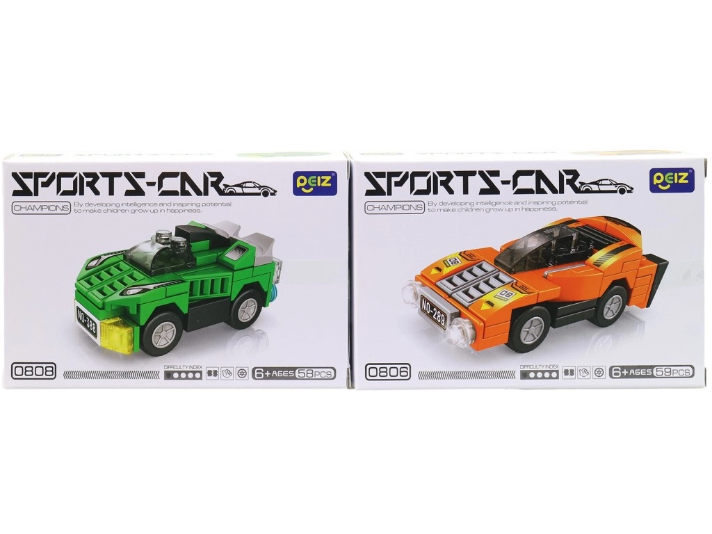 Každá krabička ponúka iné športové vozidlo – deti si môžu vybrať obľúbené farby a postaviť si vlastnú pretekársku flotilu.