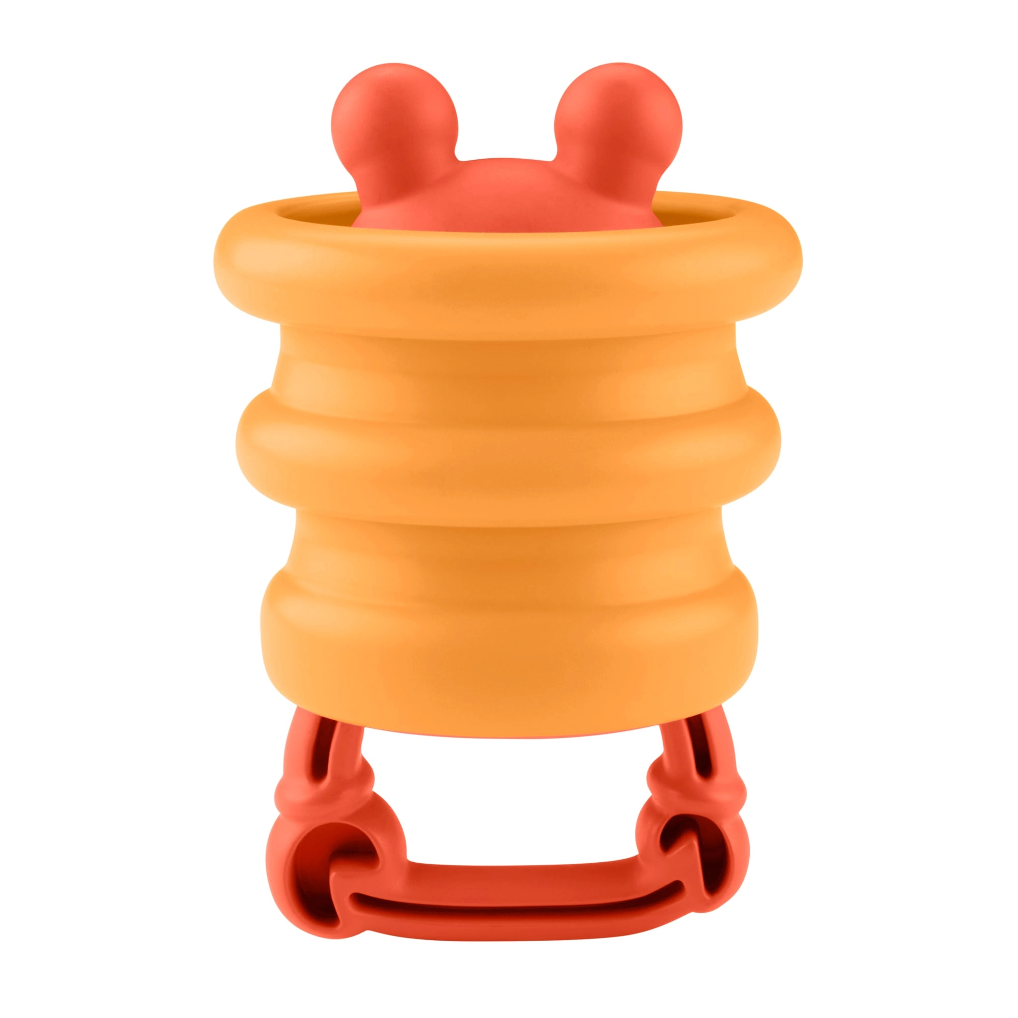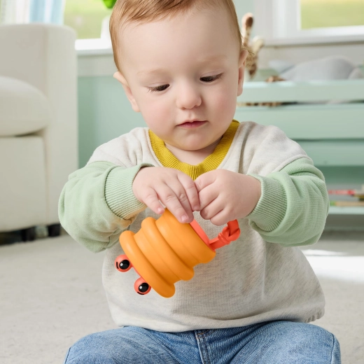 Objavte hravú senzorickú hračku v podobe usmievavého kraba, ktorá spája vizuálnu, hmatovú aj zvukovú stimuláciu. Mäkké silikónové časti sú šetrné k ďasnám a fungujú ako hryzátko, zatiaľ čo hrkajúce prvky a akordeónové telo lákajú k stlačeniu, triaseniu a naťahovaniu. To všetko pomáha rozvíjať koordináciu ruka–oko a prvé motorické zručnosti.