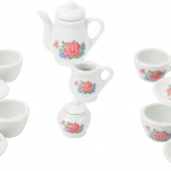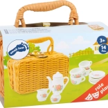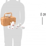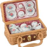 Elegantný porcelánový kávový set v prútenom kufríku s romantickým potlačom. Ideálny pre detské hranie na pikniky alebo čajové posedenia s bábikami.