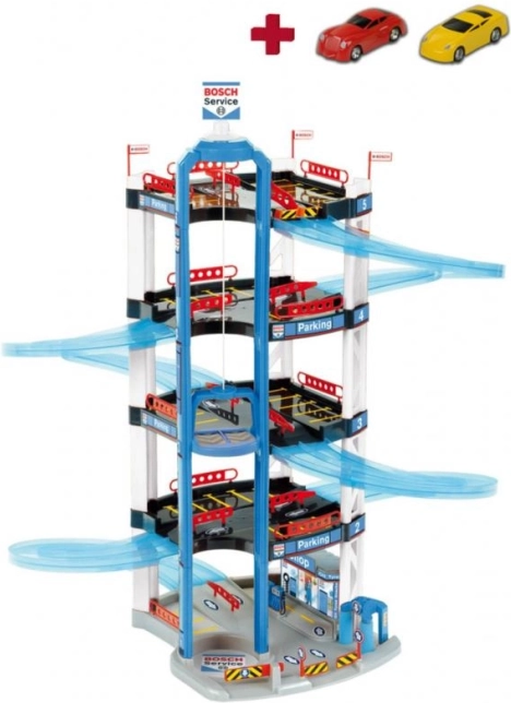 Päťposchodová parkovacia garáž BOSCH od Theo Klein ponúka variabilné zostavenie na 1, 3 alebo 5 poschodí, ručný výťah pre autíčka a umývačku na prízemí. Z kvalitného plastu pre hodiny zábavy a skvelý darček pre fanúšikov autíčok.