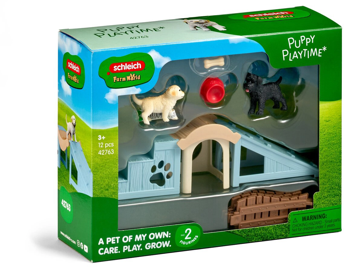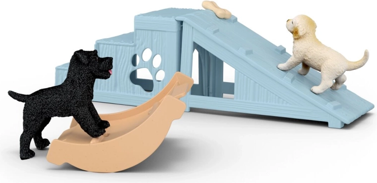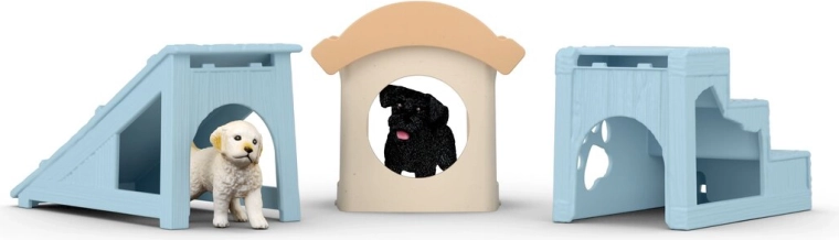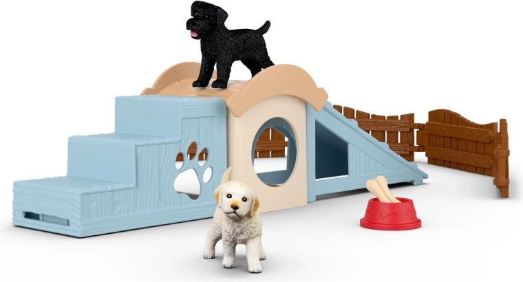 Roztomilé ihrisko pre psíkov prináša deťom nekončiacu porciu kreatívnej hry a pohybových výziev. Dve šteniatka môžu behať po rampe, skákať po schodíkoch, preliezať tunelom a oddychovať v odnímateľnej búdke, ktorej strecha sa premení na hojdačku. Odolné spracovanie SCHLEICH podporuje jemnú motoriku, fantáziu a rolové hranie u detí od 3 rokov.