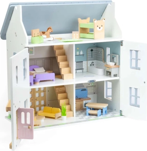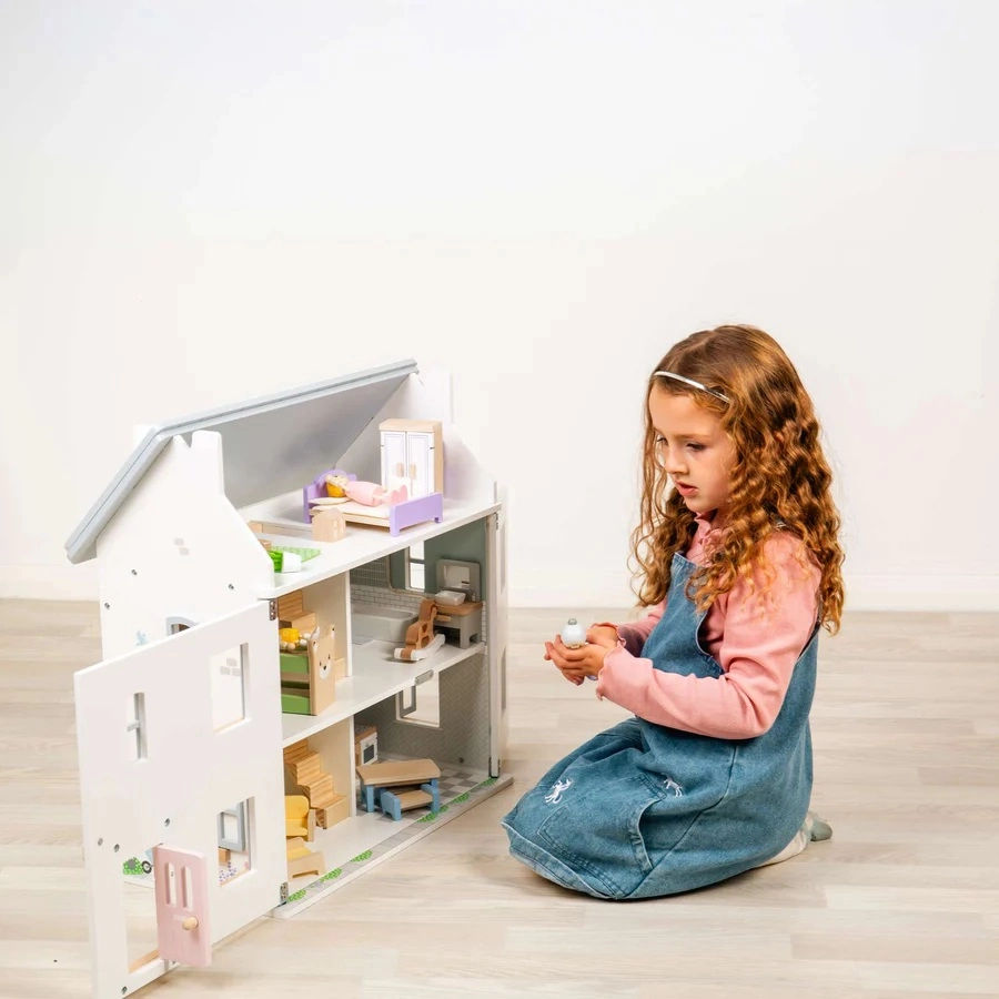 Táto univerzálna sada ponúkne všetko potrebné na vybavenie domčeka pre bábiky – od pohovky a stolíka, cez kuchynské a kúpeľňové prvky, až po postele, skriňu či doplnky do detskej izby. Vďaka precíznemu spracovaniu a príjemným pastelovým farbám pôsobí nábytok prirodzene a láka k hre.