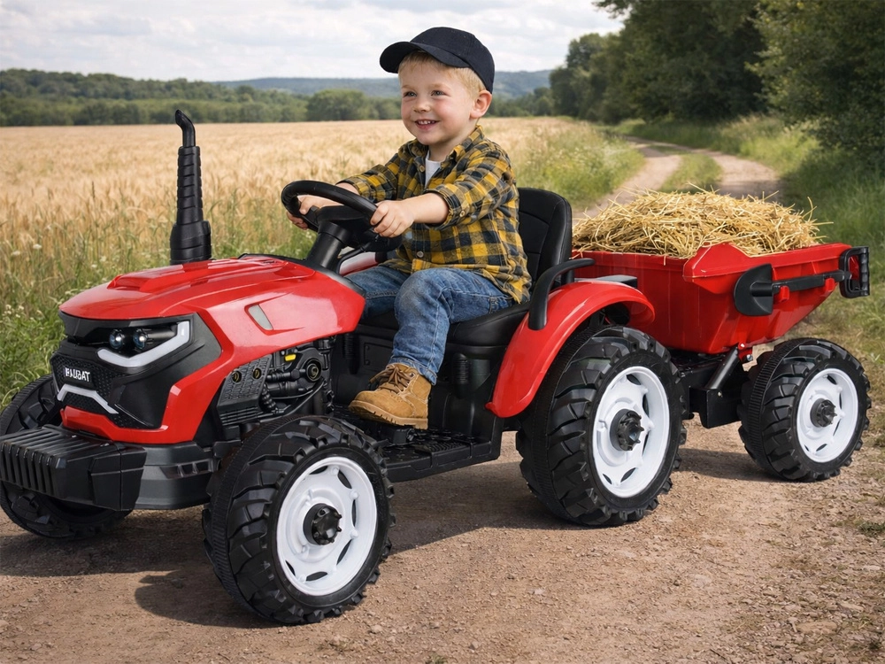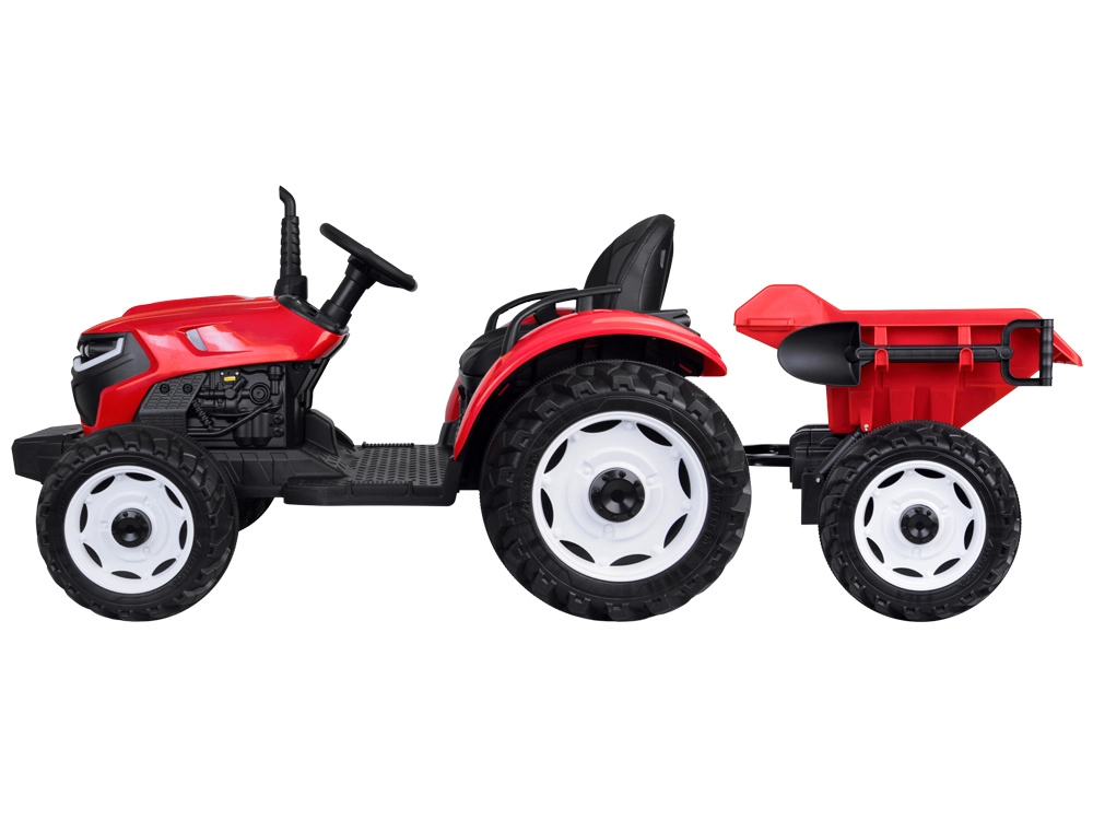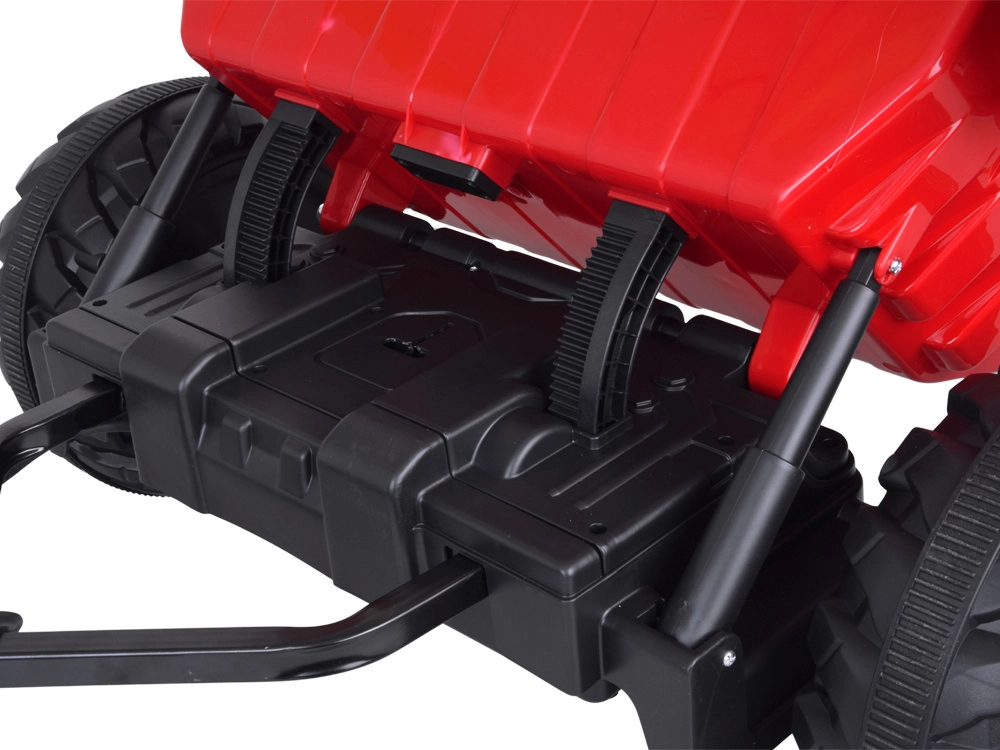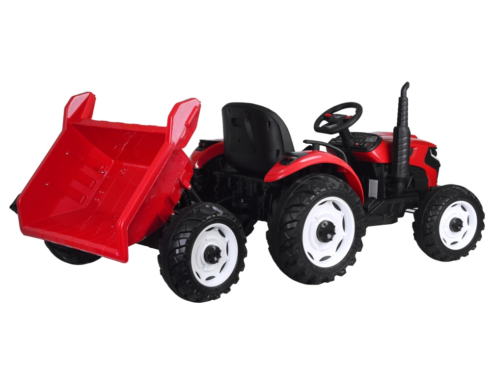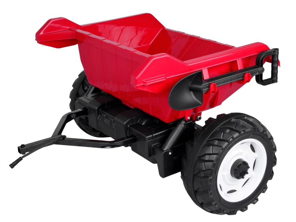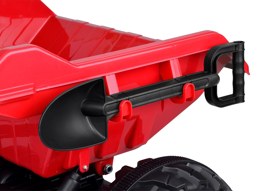 Tento červený detský traktor kombinuje realistický vzhľad s chytrými funkciami pre bezpečnú a kreatívnu hru. Automatický kiper umožní jednoduché vysýpanie nákladu z prívesu, funkciu možno vypnúť prepínačom pod kapotou. Odnímateľná lopatka rozšíri možnosti hry na záhrade aj na dvore.