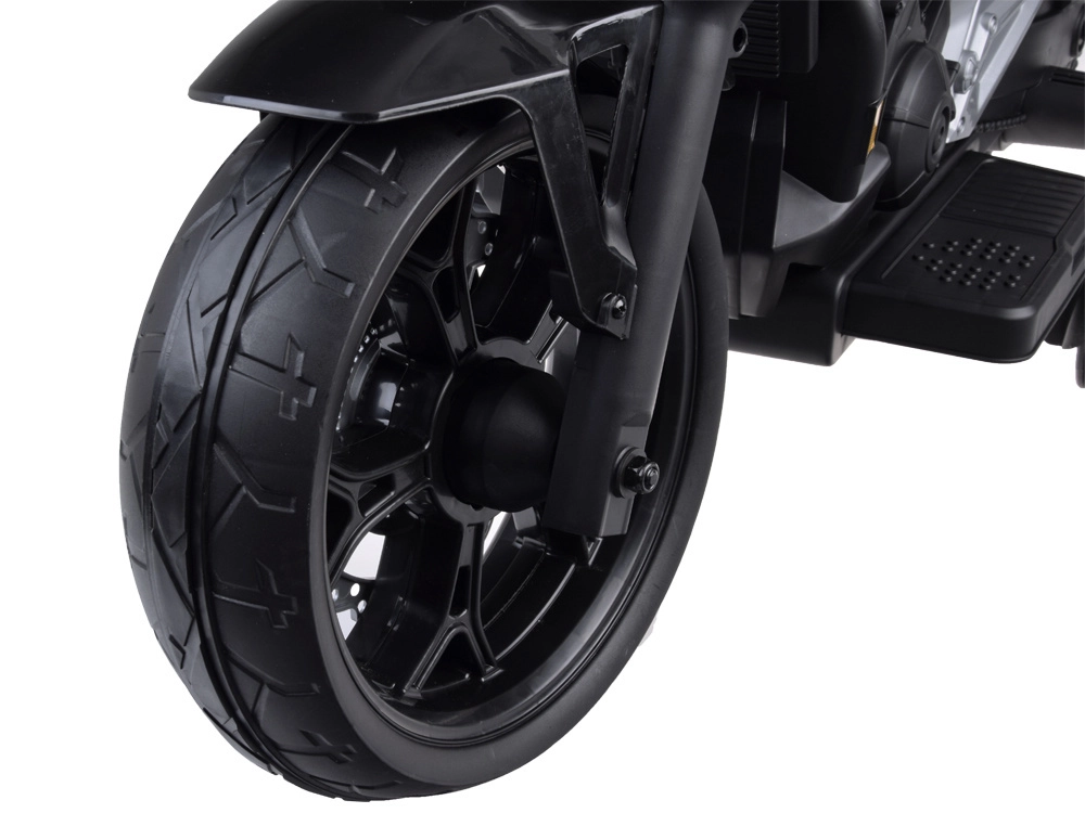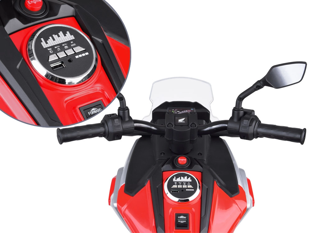 Motorka sa štartuje tlačidlom a po spustení sa ozve realistický zvuk štartu a chodu motora. Predné LED osvetlenie podčiarkuje autentický vzhľad, zatiaľ čo hudobný panel ponúka klaksón, veselé melódie, anglické rozprávky, reguláciu hlasitosti a vstupy USB a Mp3 pre obľúbené skladby.