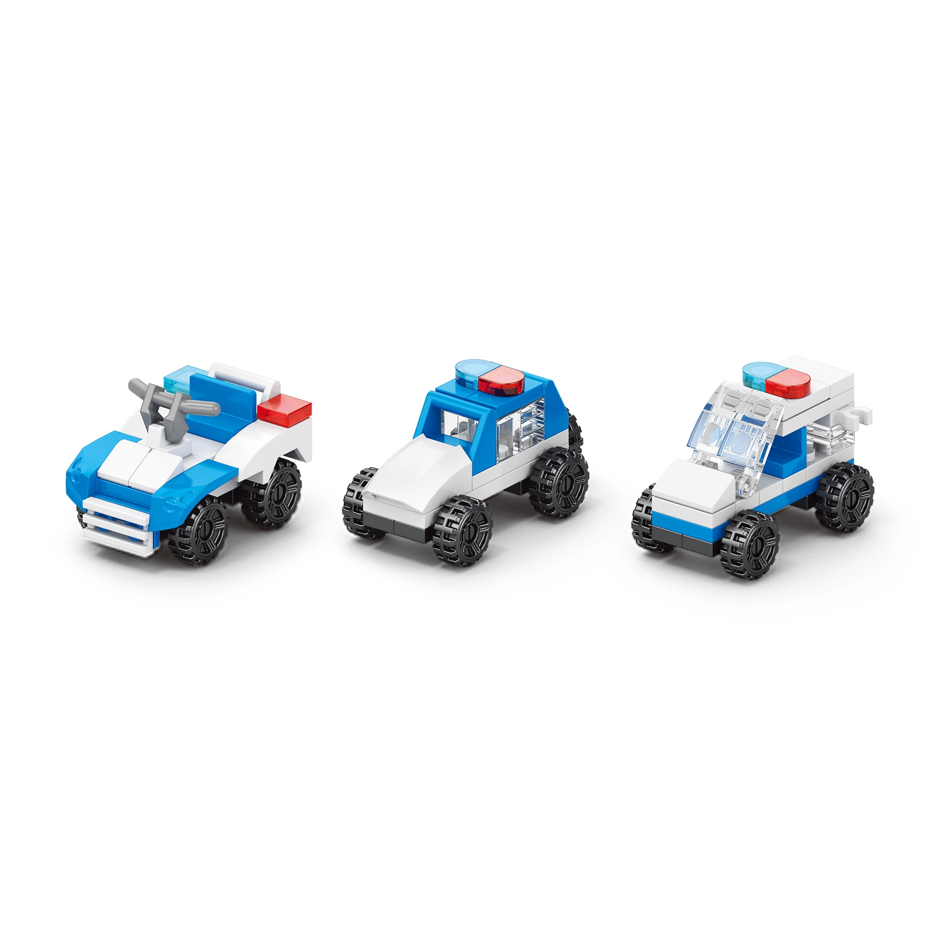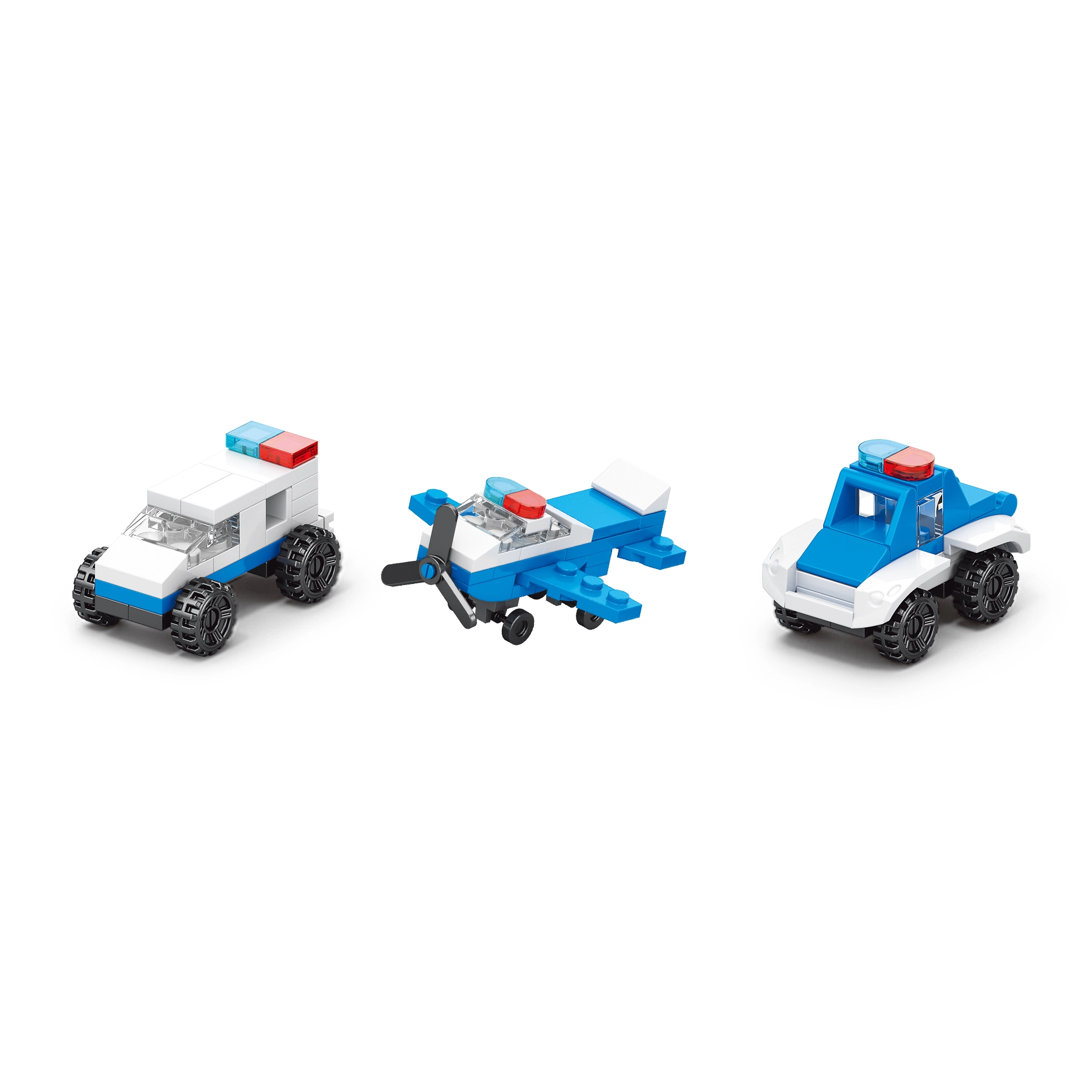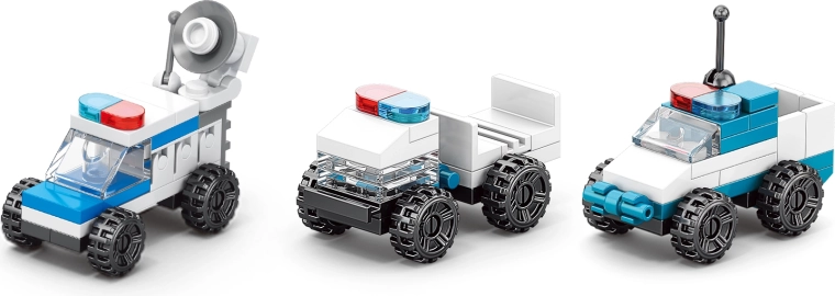 Súčasťou sú dieliky v modro‑bielej policajnej farebnosti s priehľadnými oknami a svetlami, ktoré dodajú modelom autentický vzhľad. Stavebnica je kompatibilná s väčšinou hlavných stavebníc, takže ju ľahko rozšírite o ďalšie sety a vytvoríte si vlastný mestský svet.