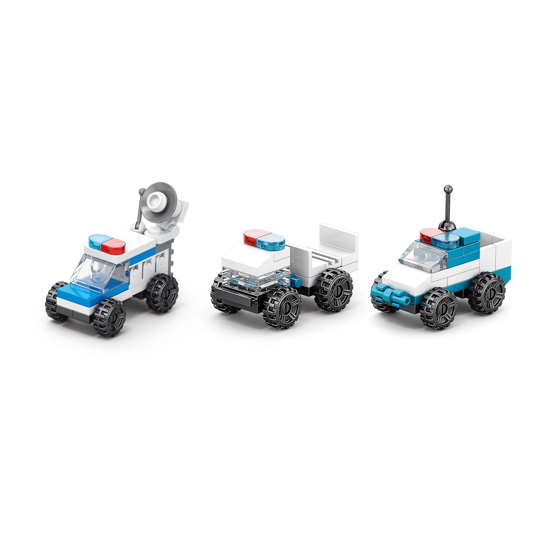 Postavte hliadkové auto, nákladiak s prívesom, vrtuľník, čln a ďalšie varianty. Každé zostavenie prináša nové príbehy a herné scenáre.