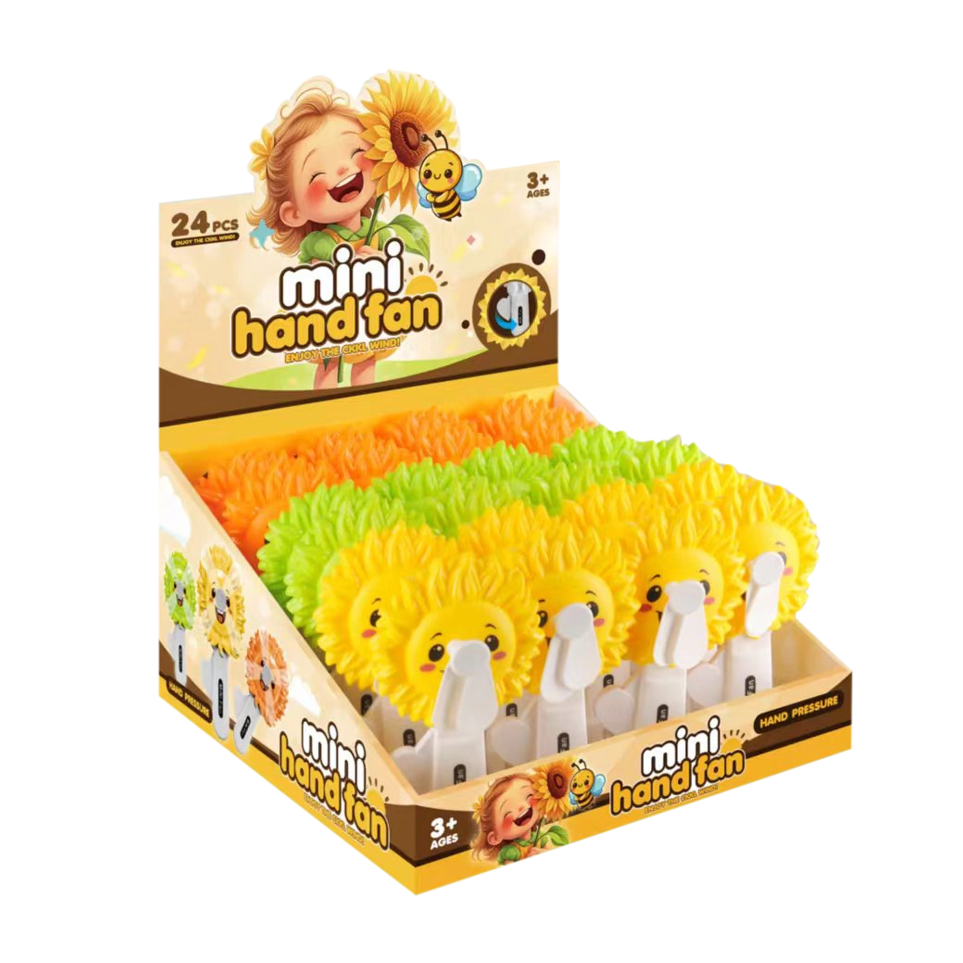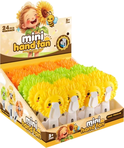 Zábavný a praktický ručný ventilátor v tvare slnečnice na rýchle osvieženie v horúcich dňoch. Mechanický pohon so zotrvačníkom bez batérií, bezpečná plastová vrtuľka a jednoduché ovládanie stláčaním páčky – ideálne pre deti aj dospelých na cesty, výlety aj k vode.