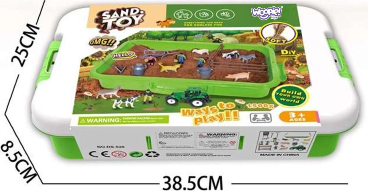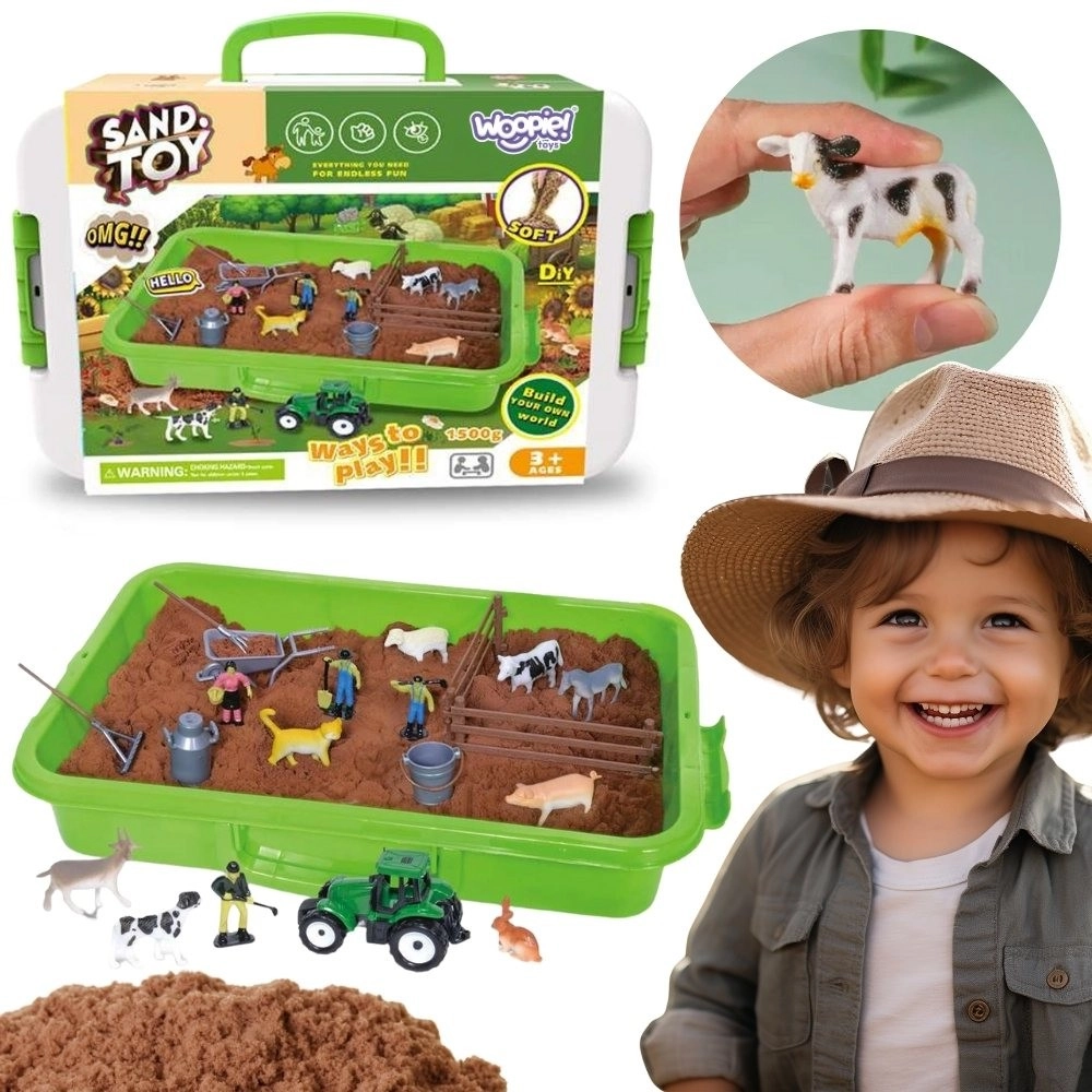 Vytvorte si vlastné hospodárstvo a rozvíjajte predstavivosť detí s bohato vybaveným setom Woopie. Kinetický piesok je príjemný na dotyk, nelepí sa, ľahko drží tvar a nevysychá, takže je ideálny na dlhé hodiny hrania. Praktický zelený kufrík s rukoväťou slúži ako prenosné pieskovisko aj úložný box – po hraní všetko jednoducho upracete.