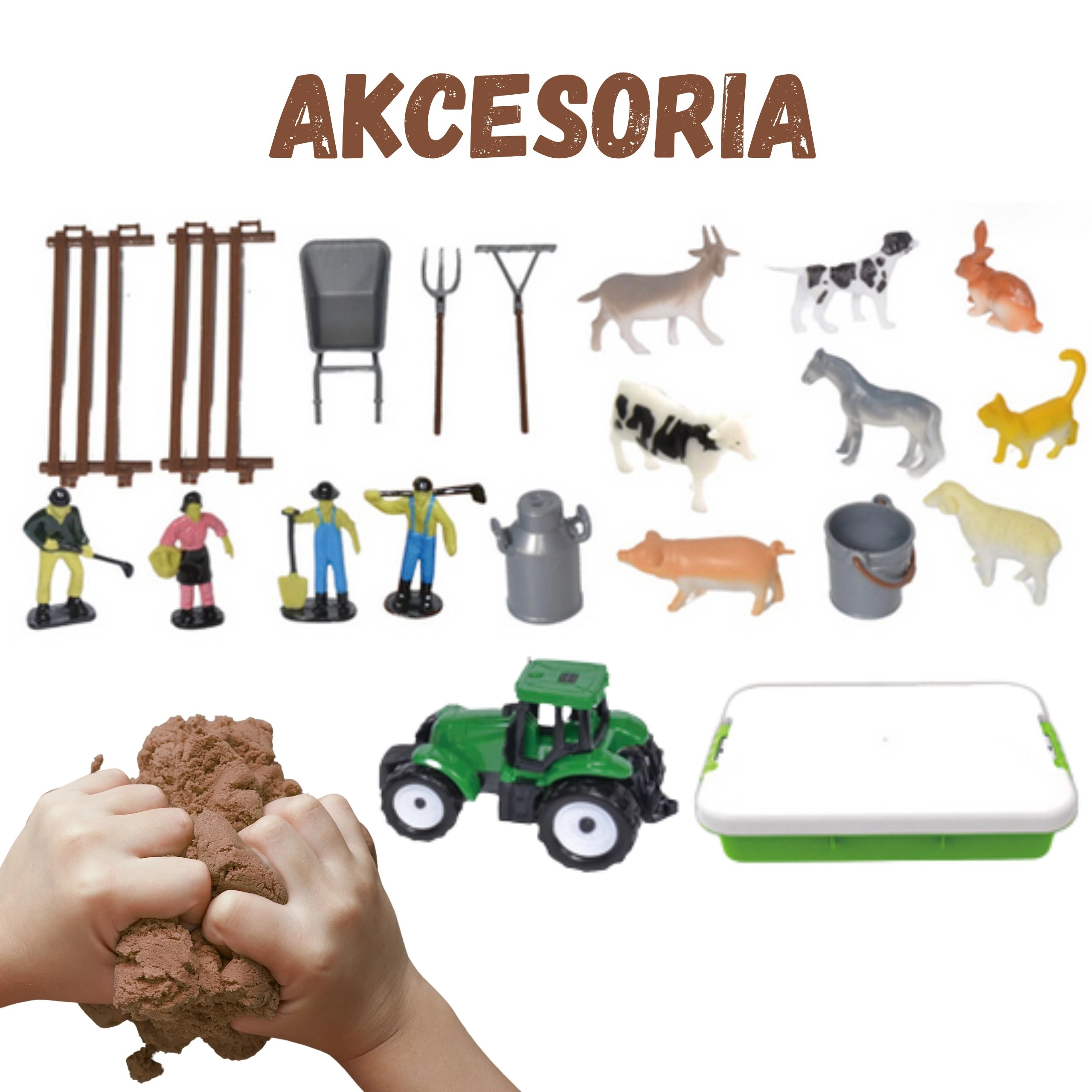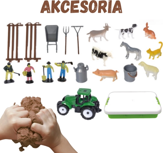- Kufrík/kuveta, kinetický piesok 1500 g, zelený traktor, 4 figúrky farmárov, figúrky zvierat (kôň, krava, ovca, prasiatko, koza, pes, mačka, králik), 2 diely oplotenia, fúrik (táčky), vidly, hrable, kanva/bandaska na mlieko, vedro, 6 zip vrecúšok