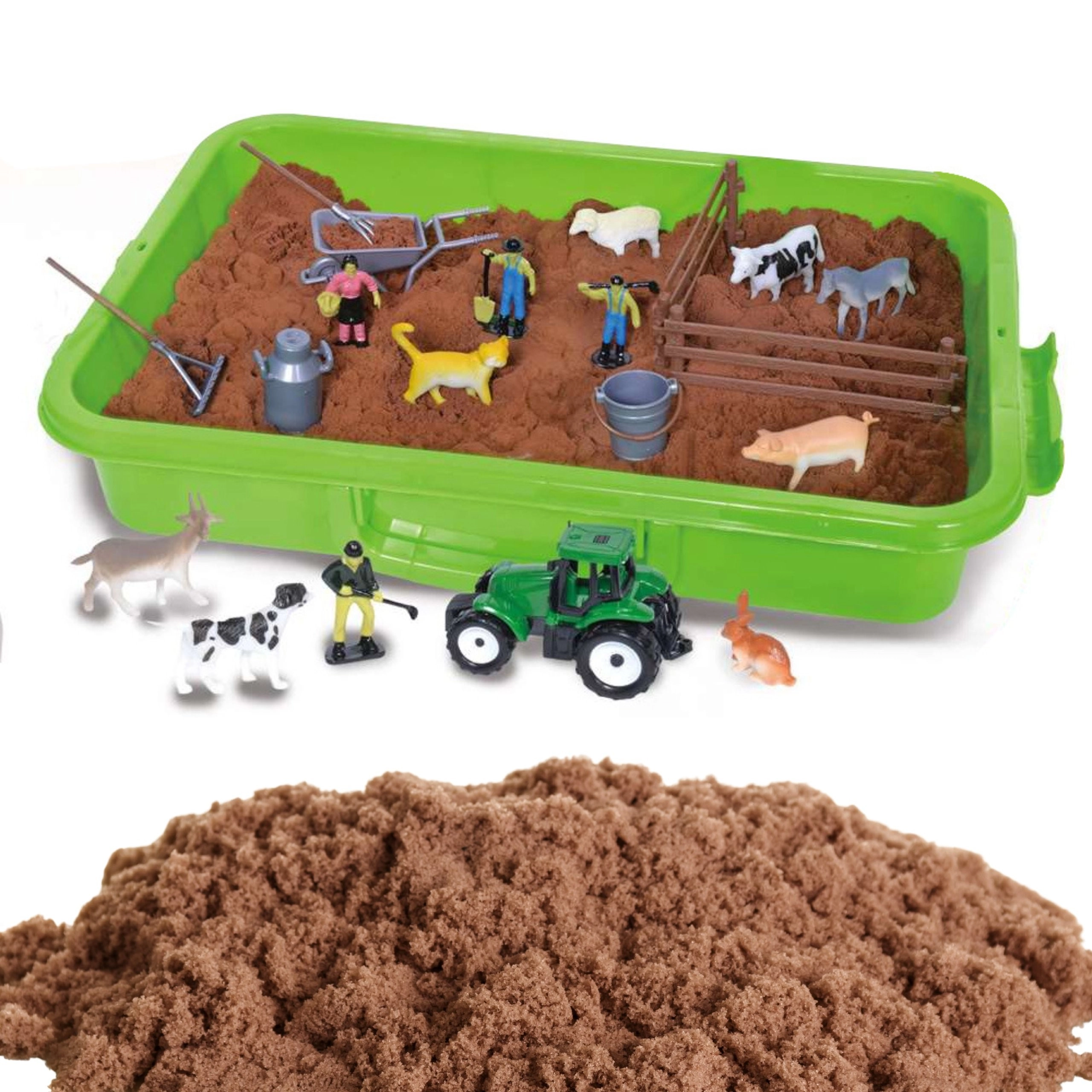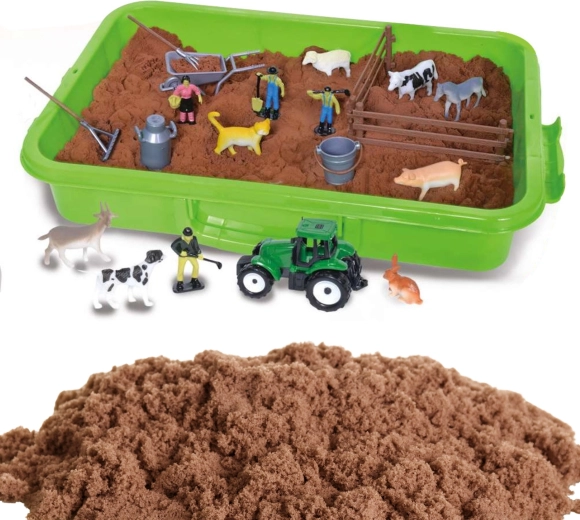 Objavte zábavný svet farmy s kreatívnym setom kinetického piesku. V praktickom kufríku nájdete až 1500 g mäkkého, tvarovateľného piesku v hnedej farbe, zelený traktor, figúrky farmárov a hospodárske zvieratá. Kufrík zároveň slúži ako herná vaňa, ktorá udržiava poriadok a umožňuje čistú, zmyslovú a kreatívnu hru doma aj na cestách.