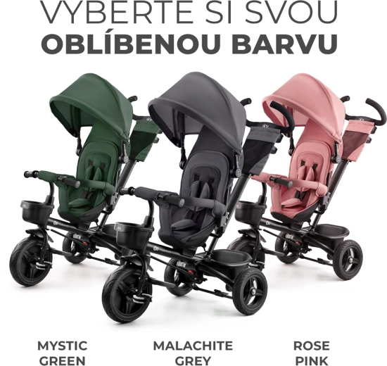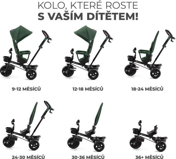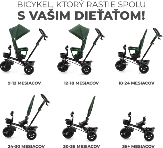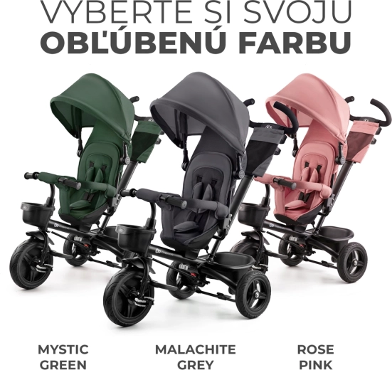 Detská trojkolka Kinderkraft Aveo v farbe Mystic Green je smart riešenie pre deti od 9 mesiacov do približne 5 rokov. Ponúka otočné sedadlo po aj proti smeru jazdy, nepreraziteľné bezúdržbové kolesá do rôznych terénov a rýchle skladanie pre ľahké prevážanie aj skladovanie. Pre maximálnu bezpečnosť nechýbajú 3-bodové pásy, bezpečnostná zábrana a vysoká opierka chrbta. Rodičia ocenia nastaviteľnú rukoväť s možnosťou blokácie riadenia a praktické doplnky vrátane košíkov a držiaka nápoja.