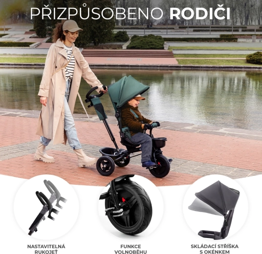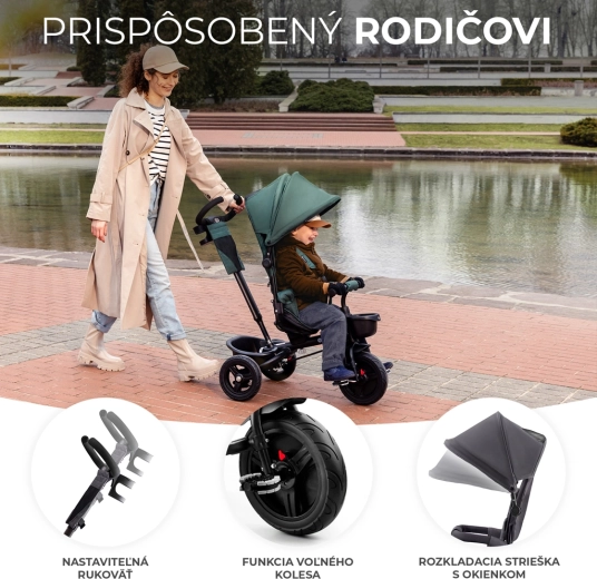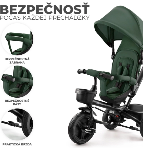 - Rodičovská kontrola – nastaviteľná rukoväť a blokácia otáčania pre bezpečné riadenie.