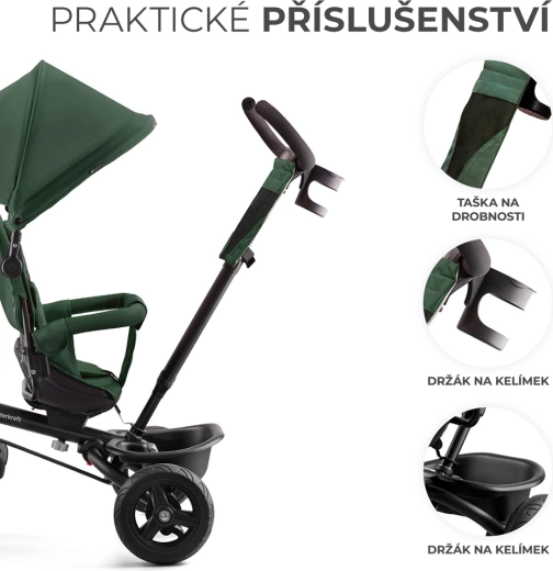 - Praktické doplnky – taška, 2 košíky a držiak nápoja; veľká skladacia strieška proti slnku a vetru.