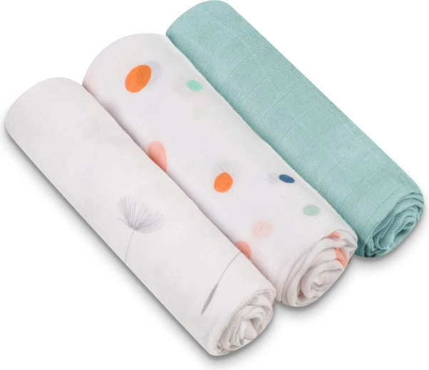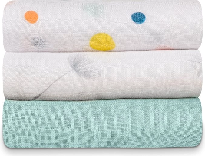 Jedna sada – mnoho možností: zavinovanie, prikrývka pri dojčení, ochrana oblečenia, utieranie, prebaľovacia podložka aj ľahká dečka.