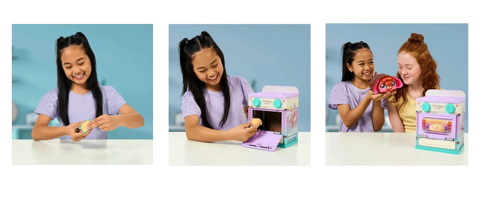 Vložte vytvarované „cesto“ do rúry, otočte gombíkom a sledujte svetielka. Po otvorení na vás čaká mäkučký, voňavý plyšák pripomínajúci sladký dezert.