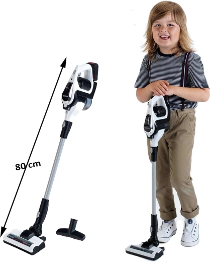 Súčasťou je otvárateľný zásobník na nečistoty na jednoduché vysypanie, široká podlahová kefa s otočným valčekom a úzka hubica na detailné čistenie. Tyč možno ľahko odňať a používať vysávač ako kompaktnú ručnú jednotku – ideálne na omrvinky a rýchle upratovanie pri hre.