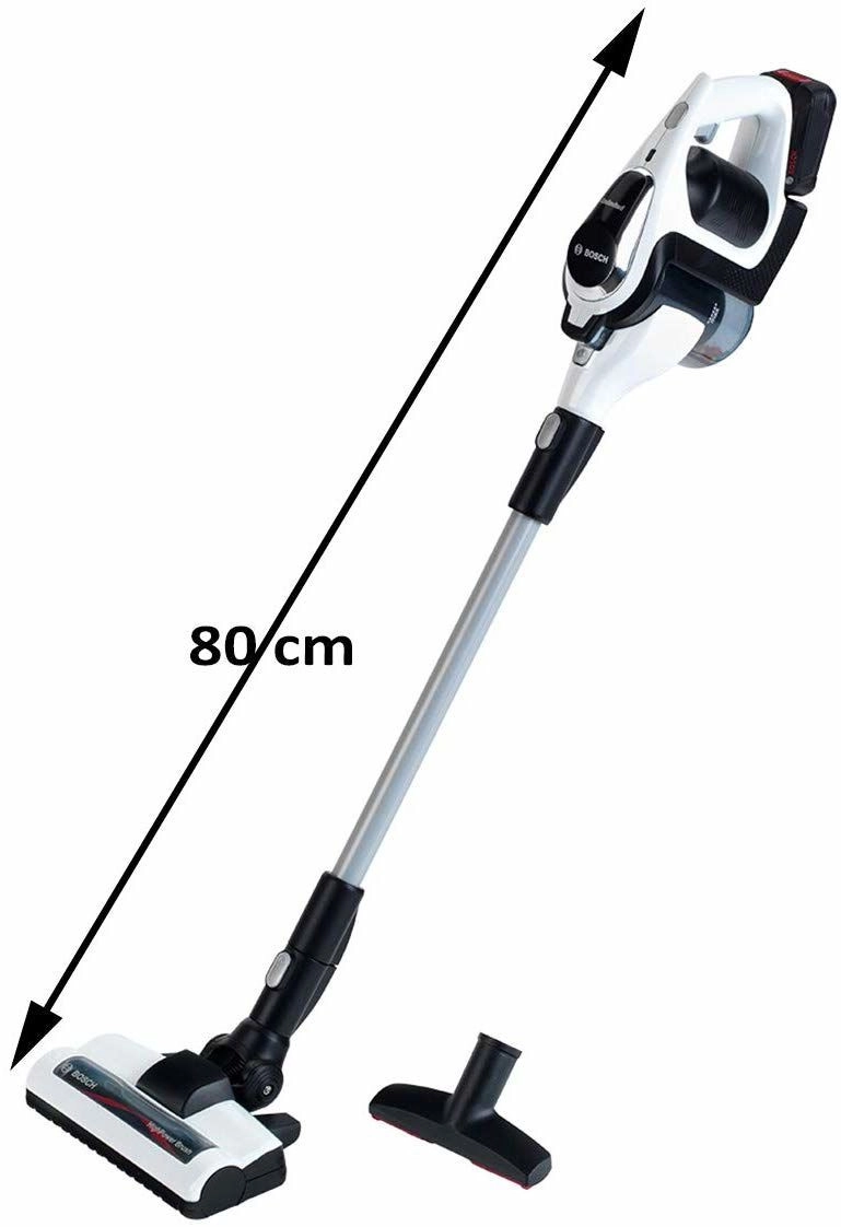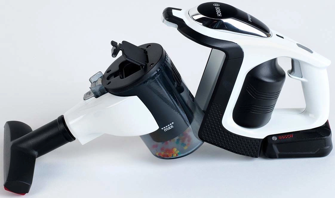 Autentický detský vysávač BOSCH Unlimited v bielo‑čiernom vyhotovení so striebornou trubicou verne napodobňuje skutočný spotrebič. Vďaka LED osvetleniu a rotujúcim guličkám v priehľadnom zásobníku pôsobí pri „vysávaní“ veľmi realisticky a pritom zostáva plne bezpečný na hranie.