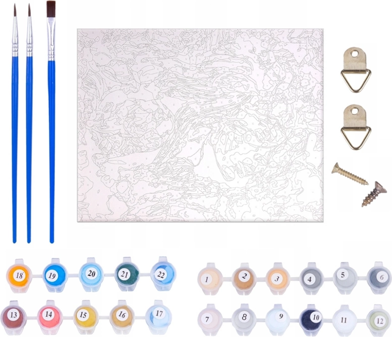 Súčasťou balenia sú kvalitné akrylové farby s dobrou krycou schopnosťou, tri nylonové štetce na detailné aj plošné ťahy a očká na zavesenie, aby ste hotové dielo mohli ihneď vystaviť. Ideálny darček aj relaxačná činnosť pre voľné chvíle.
