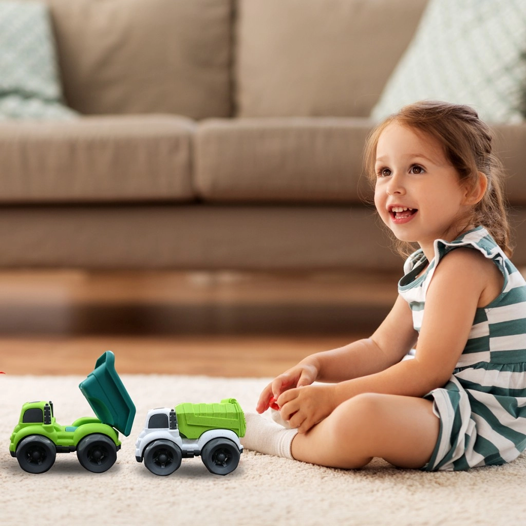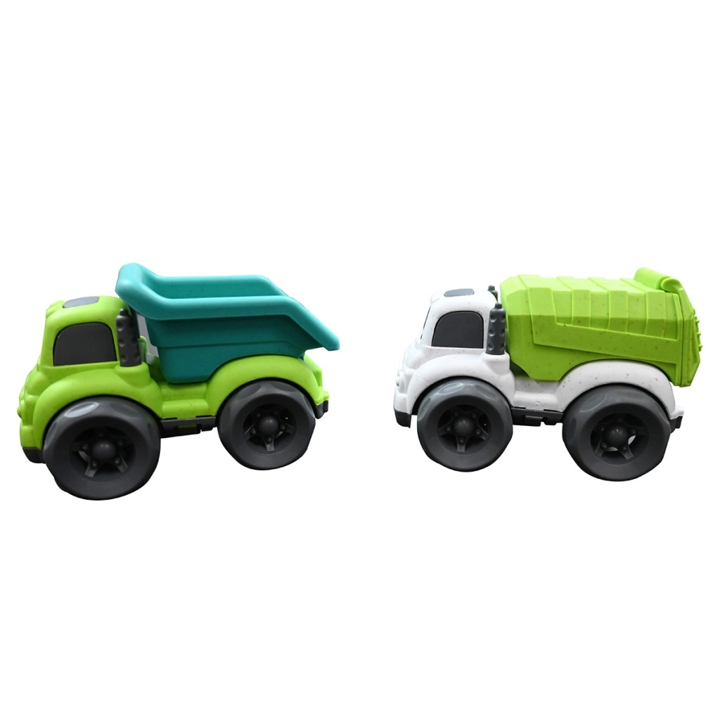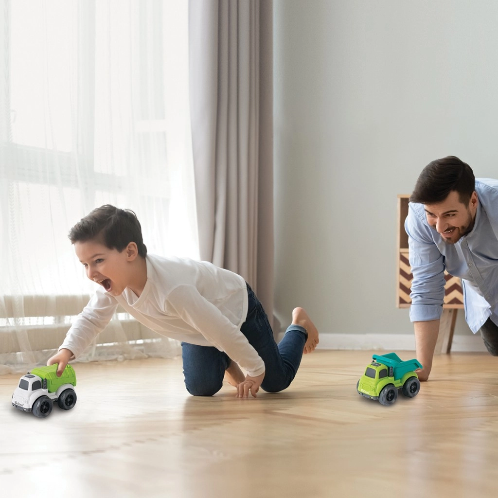 Táto ekologická sada obsahuje dve pevné nákladné autá v atraktívnych farbách – jedno so zeleno–tyrkysovou korbou a druhé s bielym podvozkom a jasne zeleným nákladovým priestorom. Vďaka veľkým kolesám jazdia hladko po podlahe a ľahko sa ovládajú aj tými najmenšími ručičkami. Funkčná vyklápacia korba podporuje hranie rolí, stavbu, prevoz „nákladu“ a prirodzený rozvoj detskej fantázie.