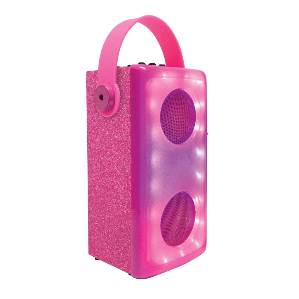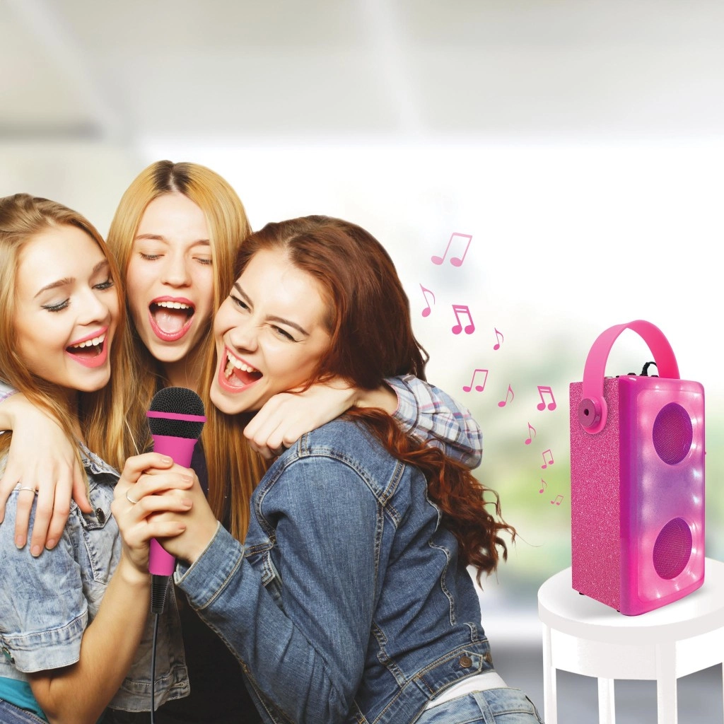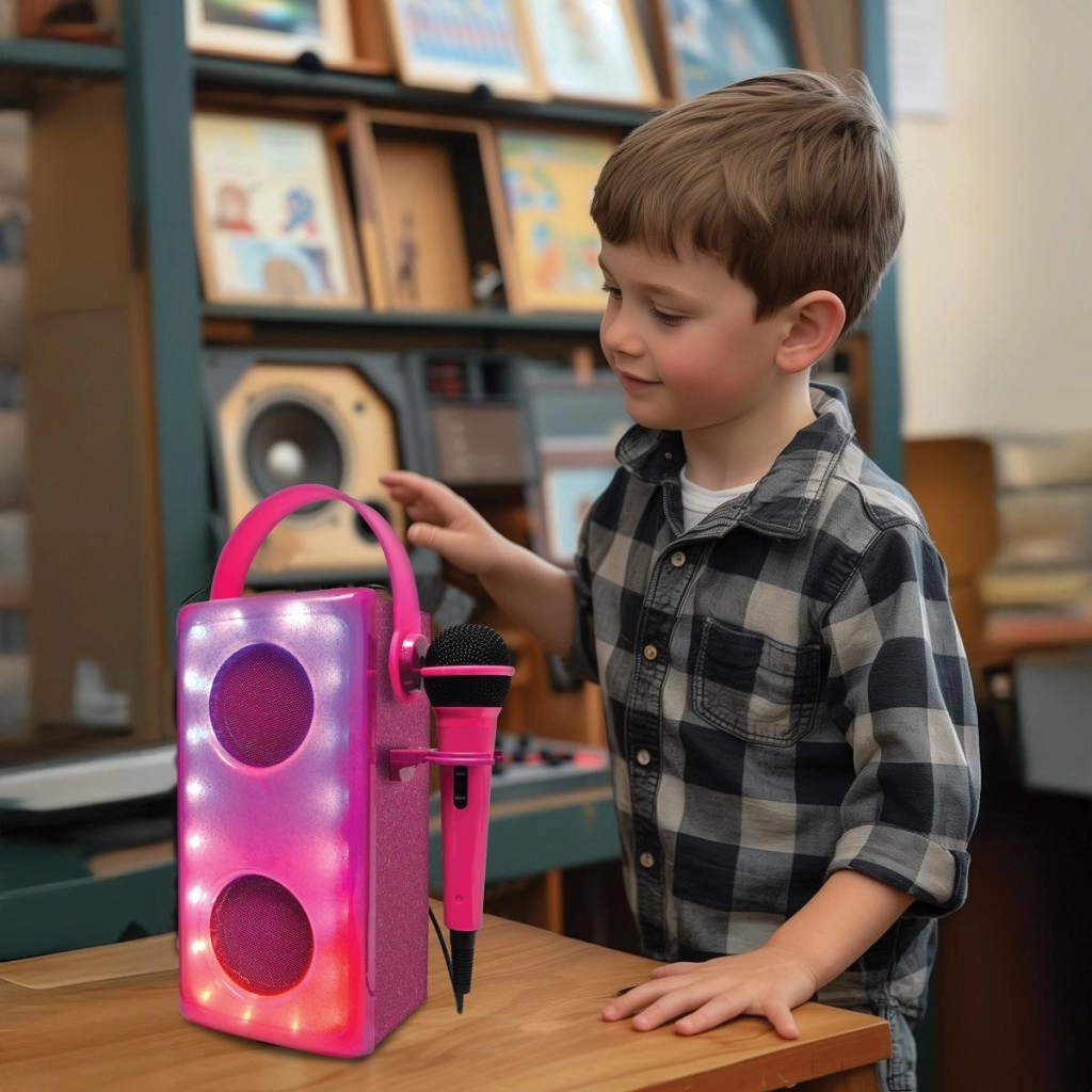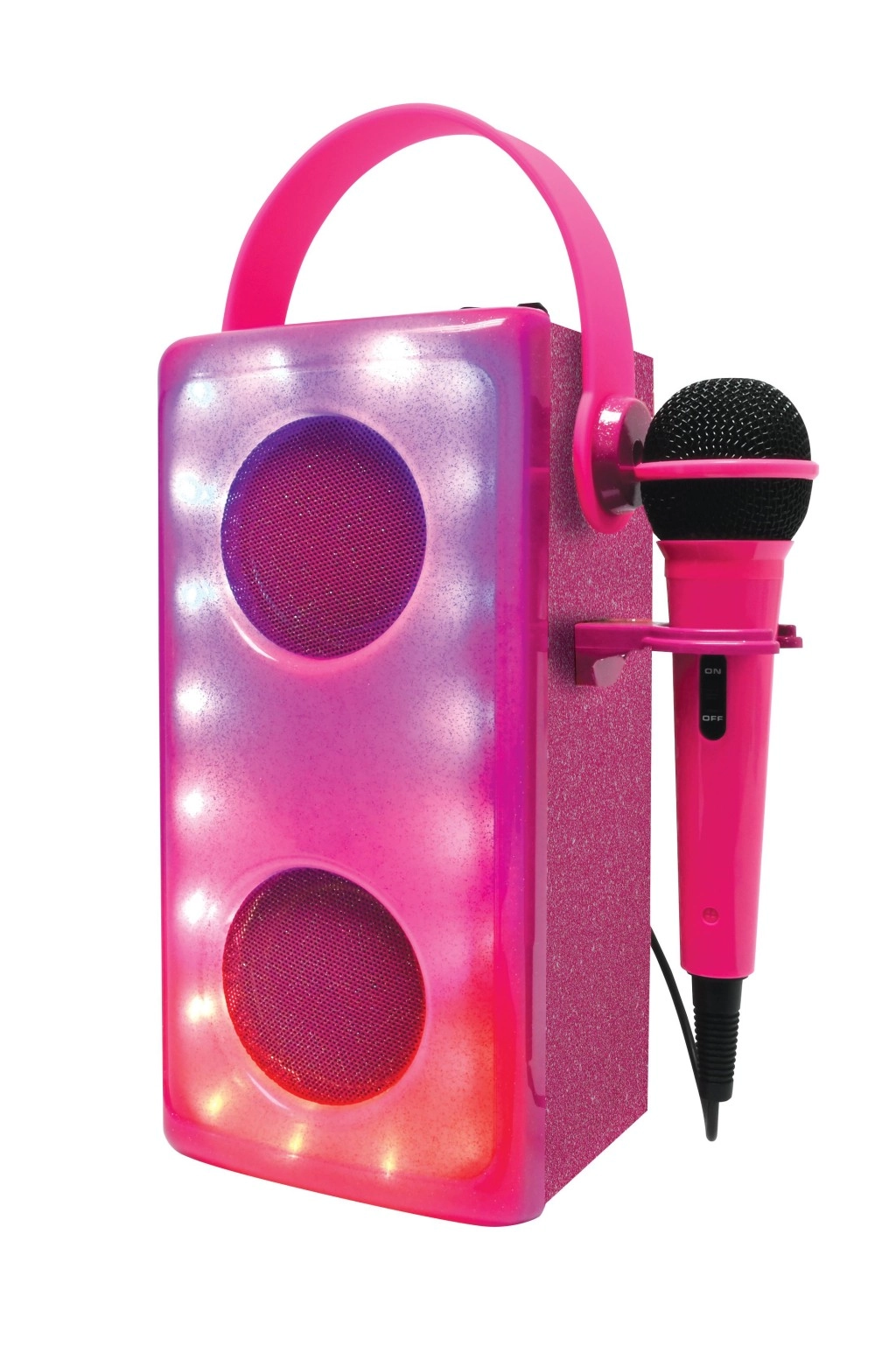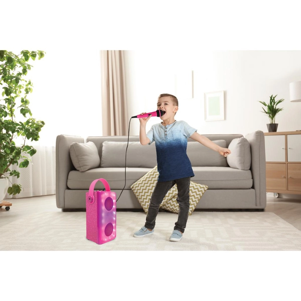 Štýlový reproduktor v trblietavo ružovom vyhotovení premení každú izbu na minipódium. Dva okrúhle meniče orámované dynamickými LED svetlami vytvárajú skvelú atmosféru, zatiaľ čo priložený mikrofón s jednoduchým vypínačom podporí kreativitu a sebavedomie malých spevákov.