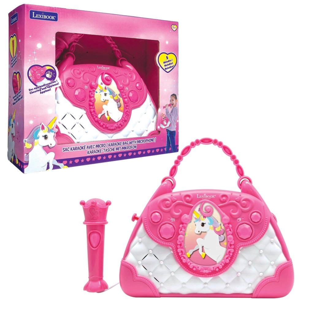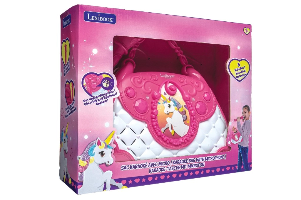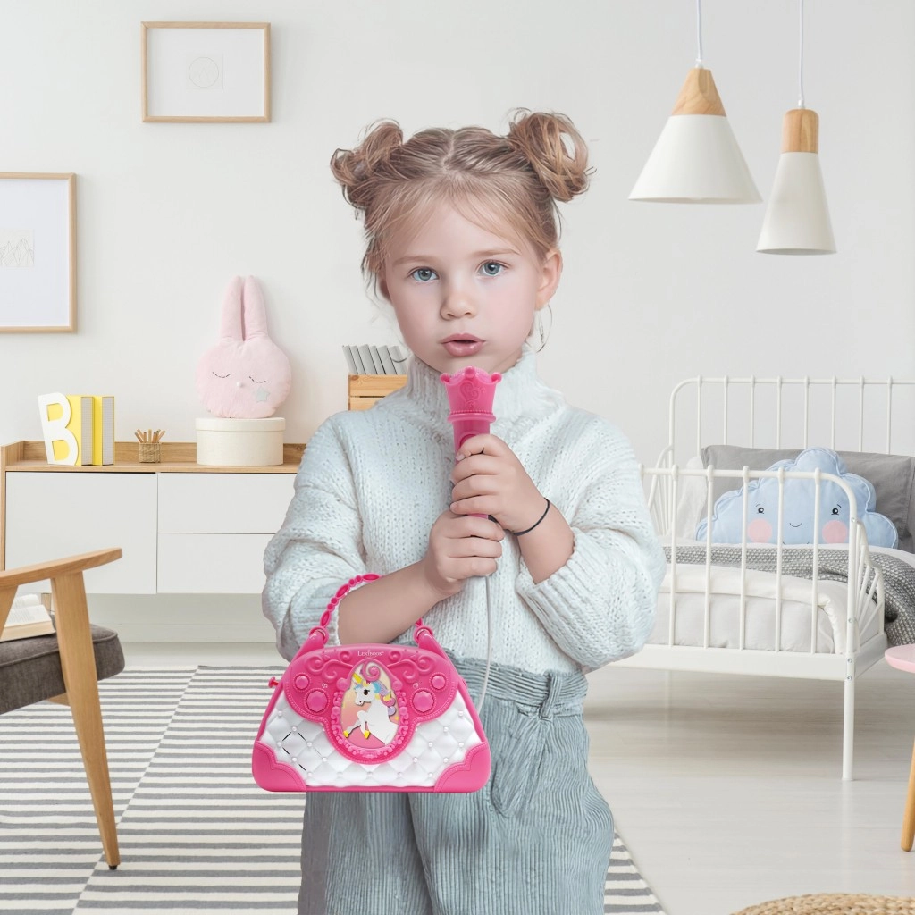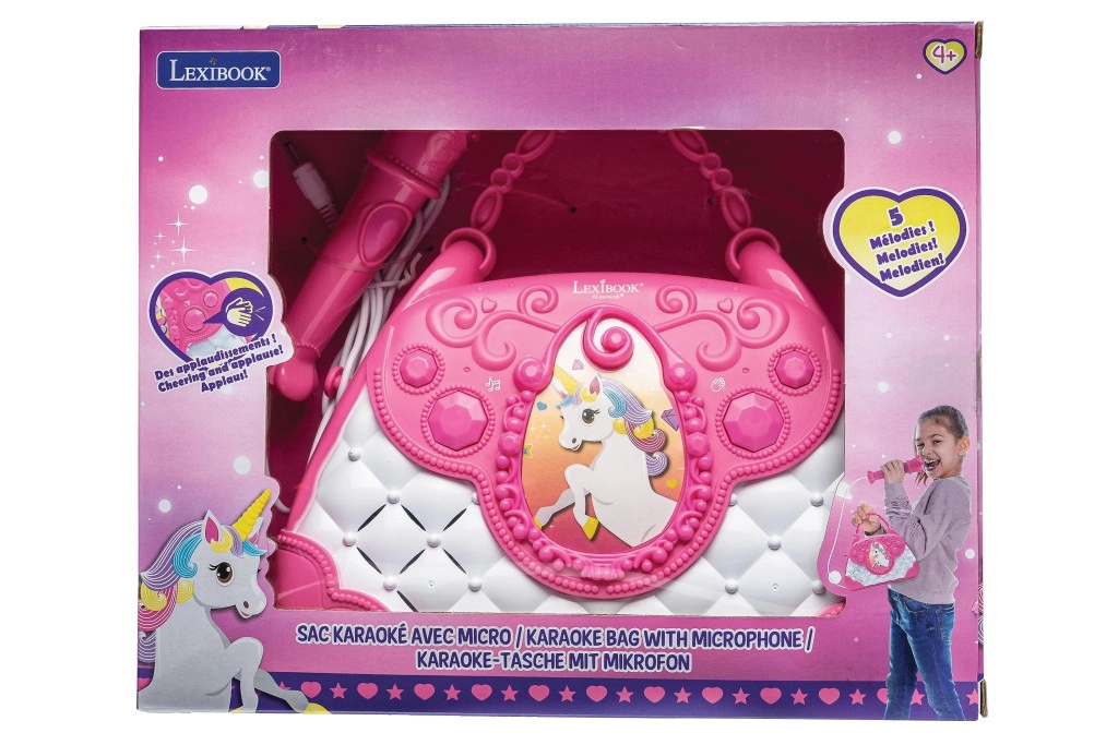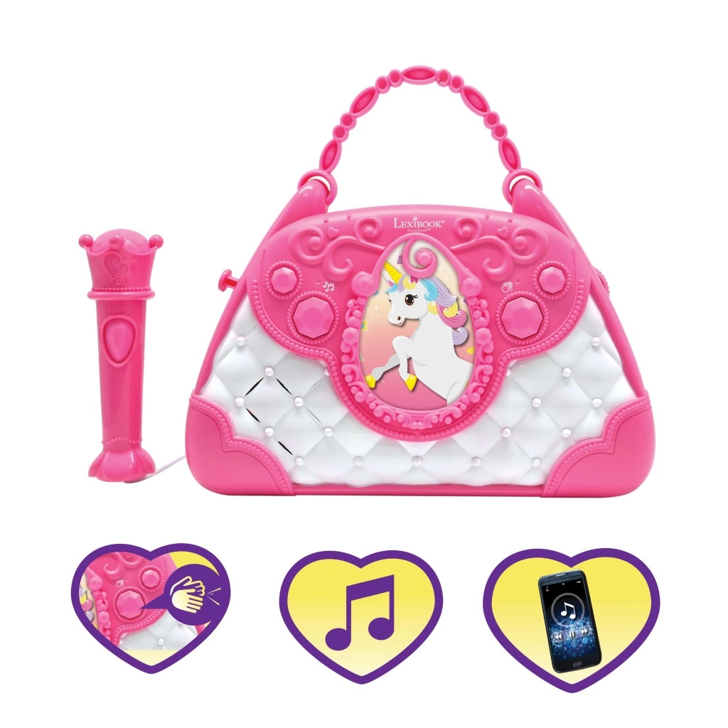Štýlová ružovo-biela kabelka s motívom Jednorožca premení každý deň na malé pódium. Deti môžu spievať do mikrofónu a počúvať svoj hlas cez výkonný zabudovaný reproduktor. Vďaka intuitívnym tlačidlám ľahko nastavia hlasitosť, zvolia melódie a aktivujú potlesk, ktorý podporí ich sebavedomie.