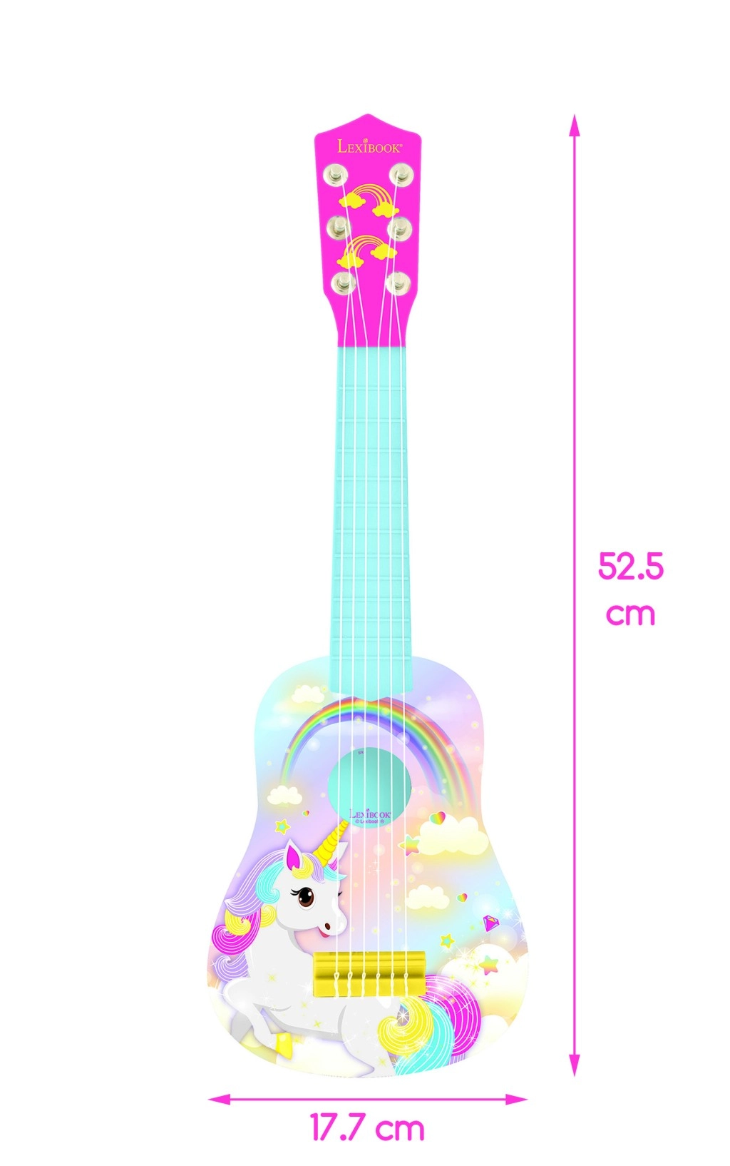 Moja prvá gitara LEXIBOOK Jednorožec je skvelou voľbou na zoznámenie detí s hudobným svetom. Vďaka kompaktným rozmerom 53 cm (21") dobre padne do detských rúk, je ľahká a ľahko sa prenáša. Pastelový dizajn s jednorožcom podnecuje fantáziu a robí z hrania zábavnú aktivitu každý deň.