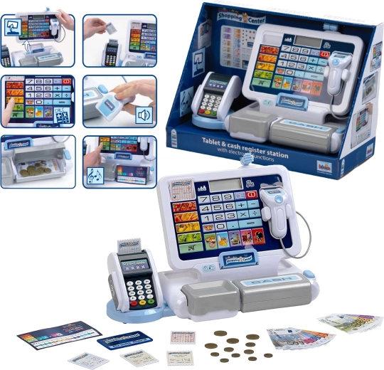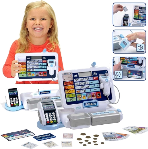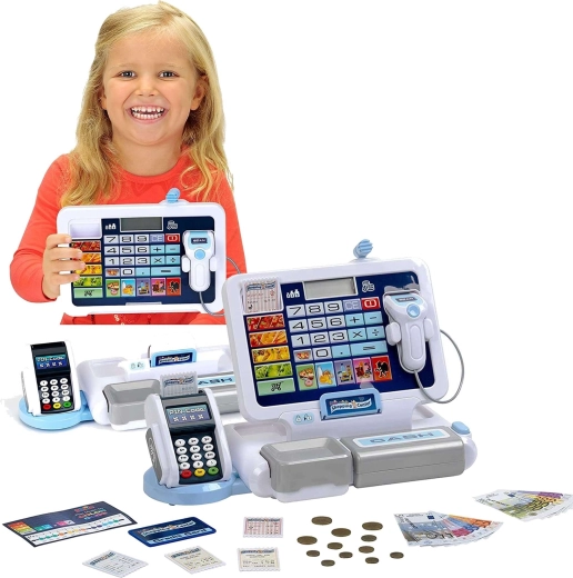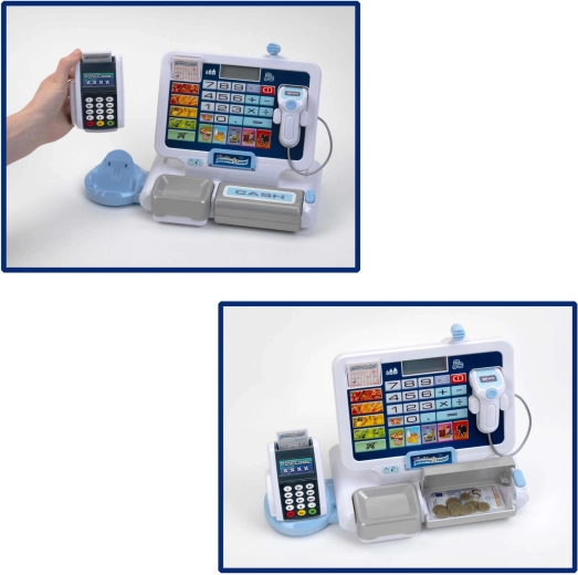 Elektronická pokladňa pre deti napodobňuje skutočnú pokladňu: má prehľadný displej s kalkulačkou, čítačku kariet, skener a výklopný šuplík na hotovosť so známym „cvaknutím“. Deti môžu „naskenovať“ tovar, zadať ceny a nechať pokladňu všetko automaticky sčítať. Dizajn v sivo-bielej farbe pôsobí moderne a čisto.