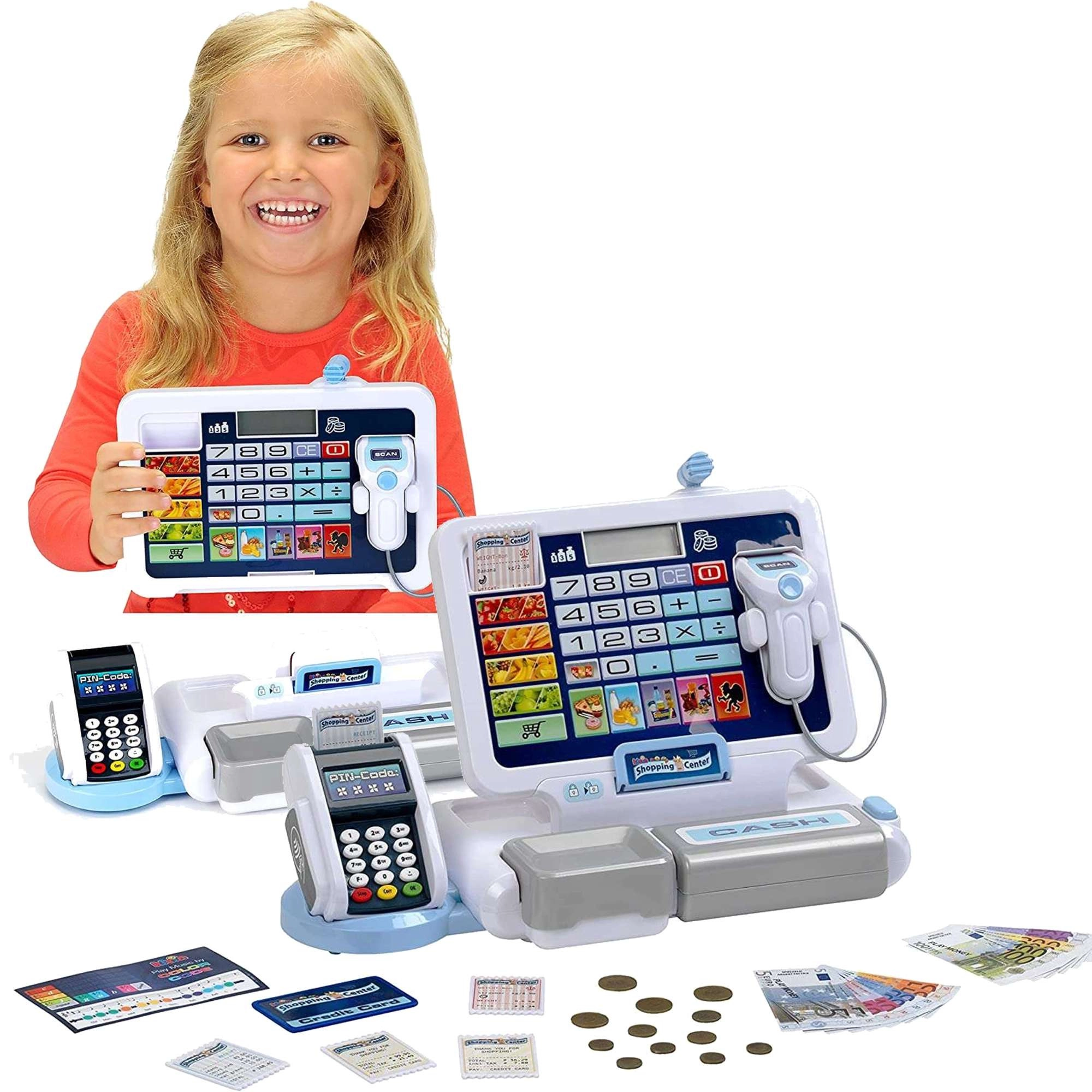 Realistická detská pokladňa s terminálom a skenerom od značky KLEIN prináša autentickú hru na obchod. Ponúka funkčný displej s kalkulačkou, otvárateľný šuplík na peniaze, čítačku kariet, zvukové efekty a bohaté príslušenstvo vrátane euromincí a bankoviek, účteniek aj „kreditnej“ karty – ideálne na rozvoj počítania, finančnej gramotnosti a rolových hier.