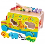 Drevená hračka Bino je dokonalým spoločníkom pre každé dieťa. Tento nákladiak slúži nielen ako ťahacia hračka, ale tiež ponúka zábavnú hudobnú zložku vďaka xylofónu na streche s paličkami. Hračka pomáha rozvíjať schopnosti ako rozpoznávanie farieb a tvarov a podporuje koordináciu pohybov.