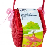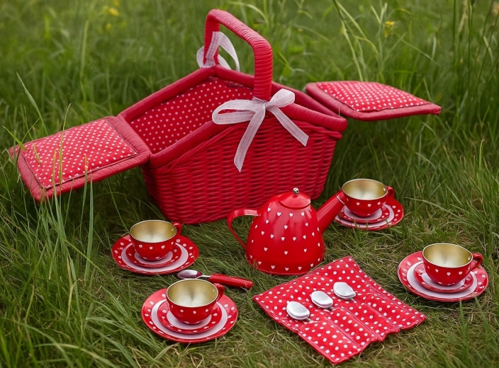 Očarujúci piknikový kôš s motívmi bodiek a srdiečok ukrýva plechovú čajovú súpravu pripravenú na každé imaginárne čajové posedenie. Pevné prevedenie s nastaviteľnými páskami na suchý zips a textilným lemom zabezpečuje ľahké prenášanie aj ukladanie všetkých dielov. Deti si precvičia spoločenskú interakciu, motoriku aj kreativitu.