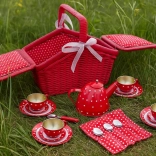 Všetko potrebné v jednom koši: kanvica, podnos na príbor, 4 veľké a 4 malé taniere, 4 šálky a 4 lyžičky – pripravené na okamžitú hru.
