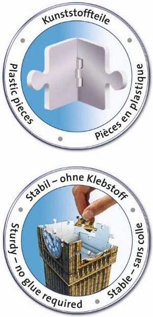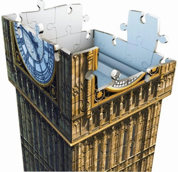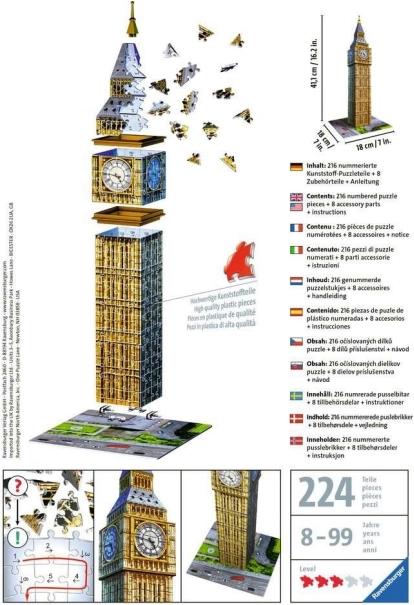 Sada obsahuje celkom 216 očíslovaných dielikov puzzle, 8 kusov príslušenstva a podrobný návod. Po dokončení puzzle meria približne 18 x 18 x 41 cm. Tento model je ideálny ako pre fanúšikov spoločnosti Ravensburger, tak pre tých, kto milujú architektúru a Londýn.